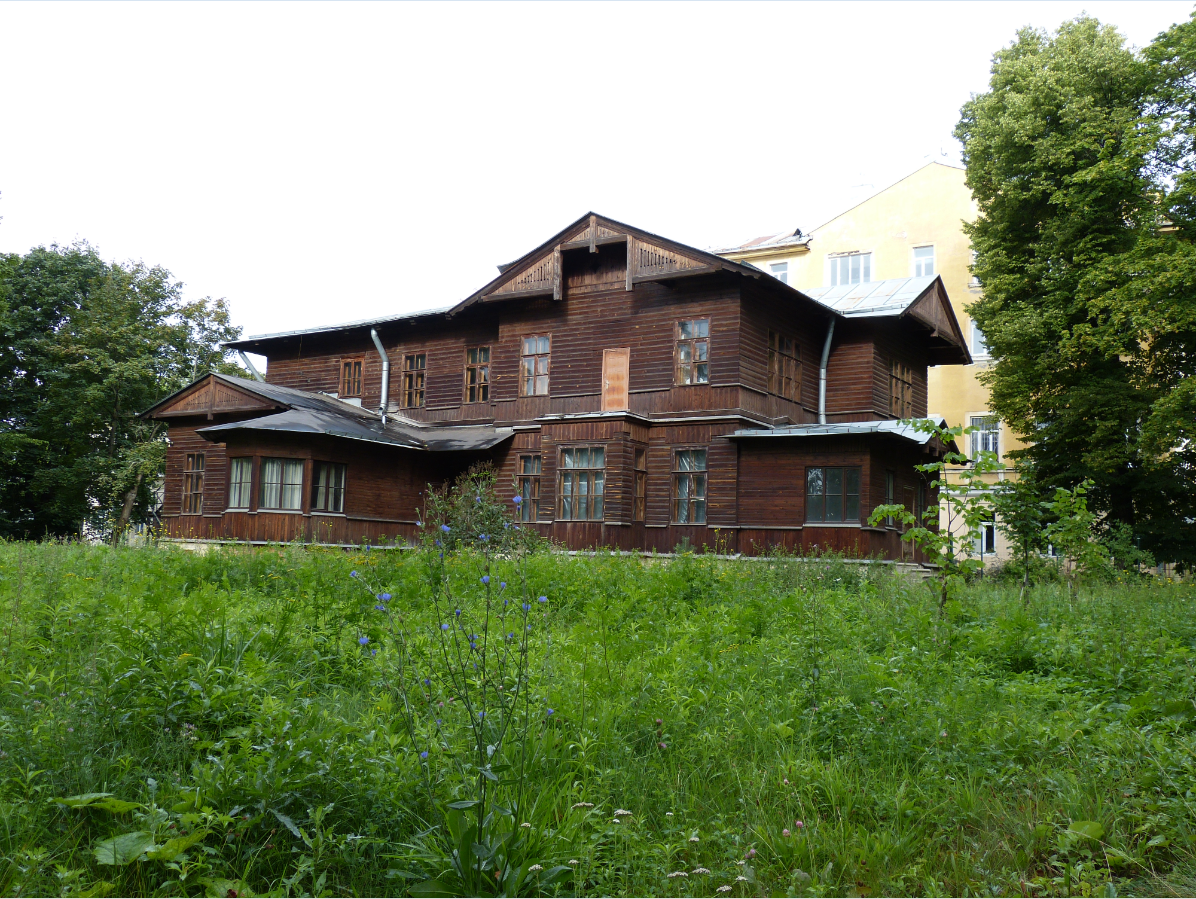 А буквально в сотне метров от этого прекрасного здания стоит вот такая деревянная постройка. Это бывший служебный флигель дачи Доливо-Добровольской, которому скоро исполнится двести лет.