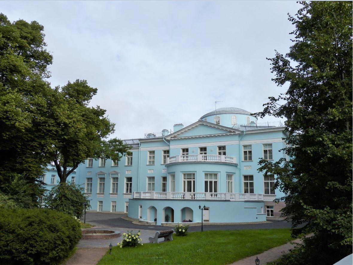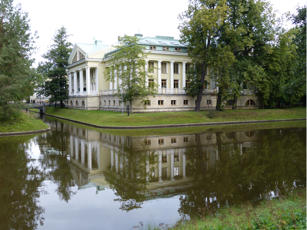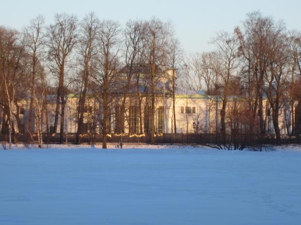 Если немного отойти к Малой Невке, то можно даже рассмотреть садовый фасад здания.