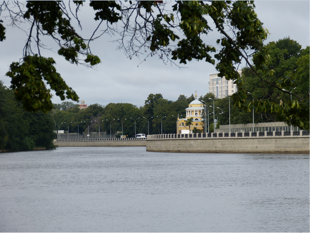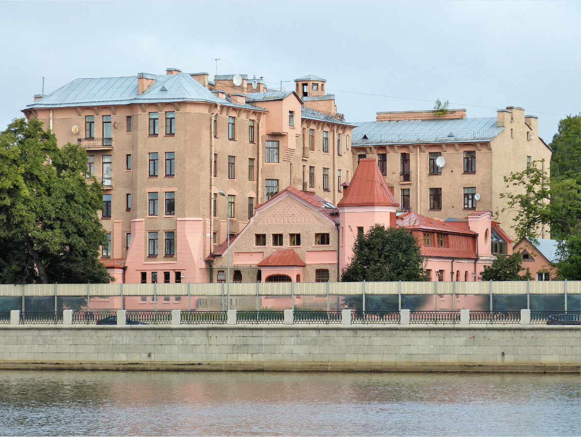 С набережной Средней Невки открывается вид на особняк и доходный дом А. К. Леммериха на противоположном берегу.