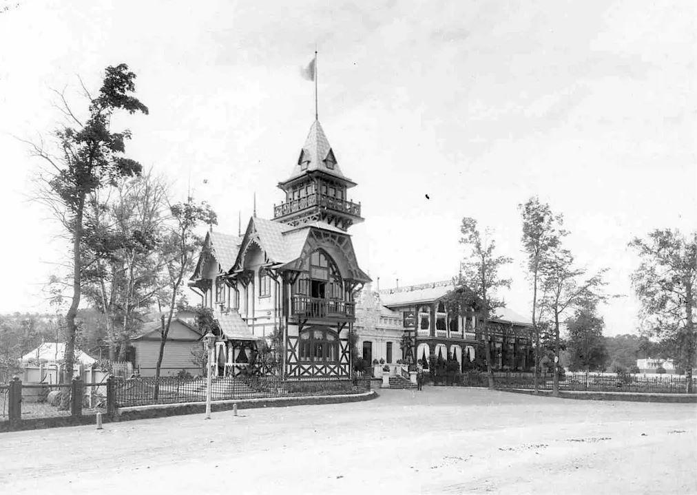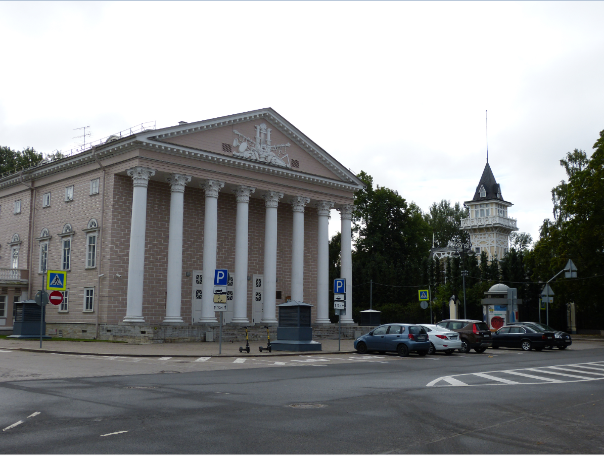 Рядом с театром виднеется причудливая башенка бывшей дачи Марии Клейнмихель.