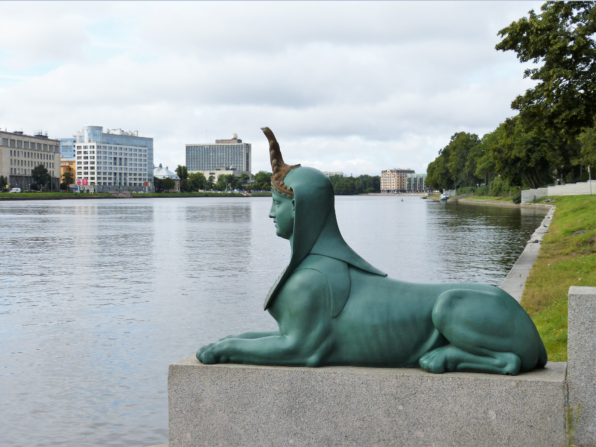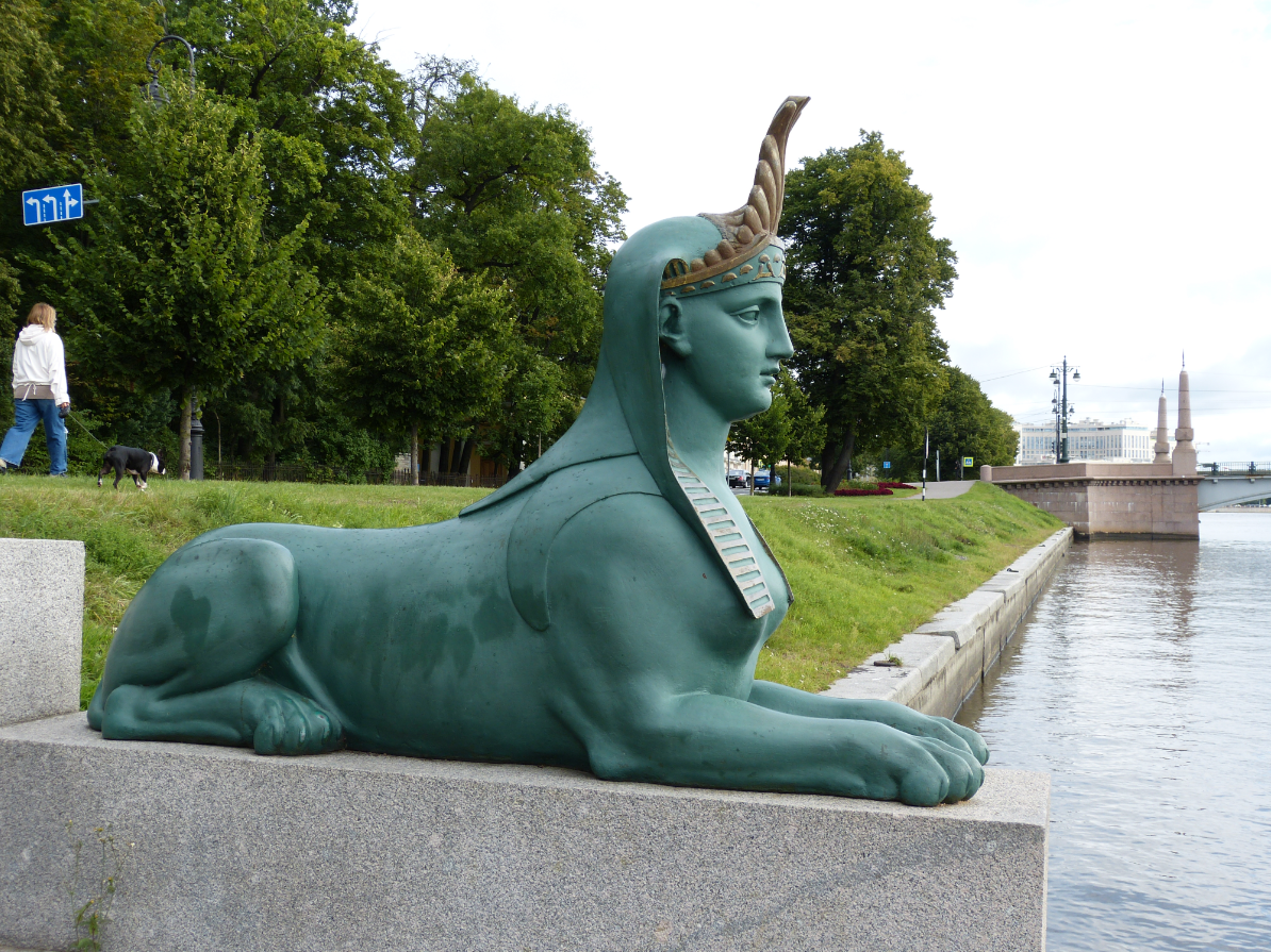 Их отлили в 1826 году на заводе Берда как пробные изваяния для Египетского моста через Фонтанку. Пробники внимательно осмотрели, внесли какие-то изменения и потом уже сделали тех сфинксов, которые ныне украшают берега Фонтанки. А эти долго хранились на заводе, пока в конце XIX — начале XX веков не были выкуплены купцом Галактионовым. Оо поставил сфинксов перед своим домом на Верейской улице, а затем, после переезда на соседнюю Можайскую улицу, перевёз на новое место и скульптуры. Там они стояли до 60-х годов ХХ века. Но при реконструкции городских набережных Ленинграда было принято решение перенести их на пристань у Каменноостровского моста. Сфинксов отреставрировали и в 1971 году поставили на берегу Малой Невки.