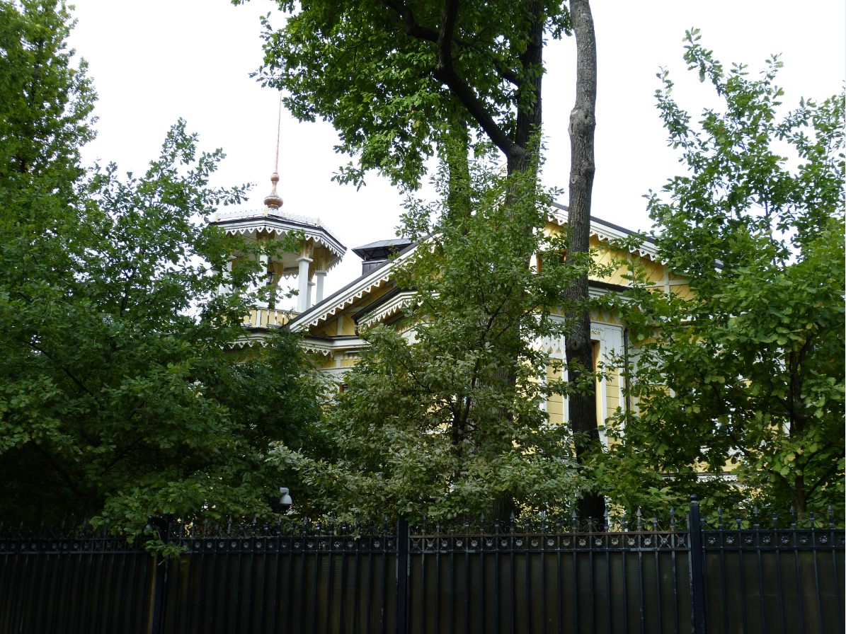 Иногда через высокие заборы и густую зелень проглядывает что-то интересное. Но рассмотреть эти здания в летнюю пору невозможно.