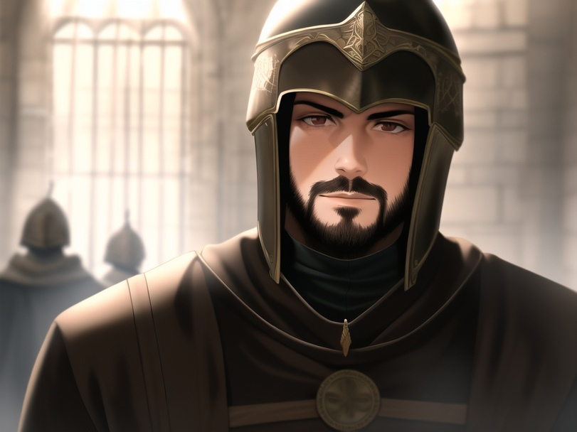masterpiece, best quality, anime poster, 1boy, peasants, (((guards))), steal armor, black chestplate, open helmet, face, short hair, stubble beard, open eyes, closed mouth, close-up, solo focus, indoors, (temple), (((middle ages europe))), ((dark fantasy)), (gothic), lens distortion, white balance, dramatic lighting, tone mapped, lens flare, by studio (((((MAPPA))))