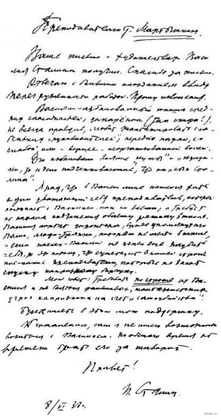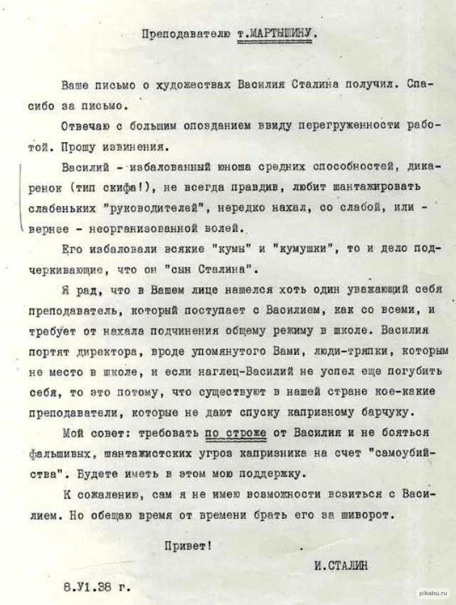 Оригинал ответа хранится в Архиве Президента Российской Федерации — бывшем Архиве Политбюро ЦК КПСС (Письмо И. В. Сталина учителю Василия Сталина В. В. Мартышину от 15 июня 1938 г. Ф. 45. Оп. 1. Д. 1552. Л. 9).