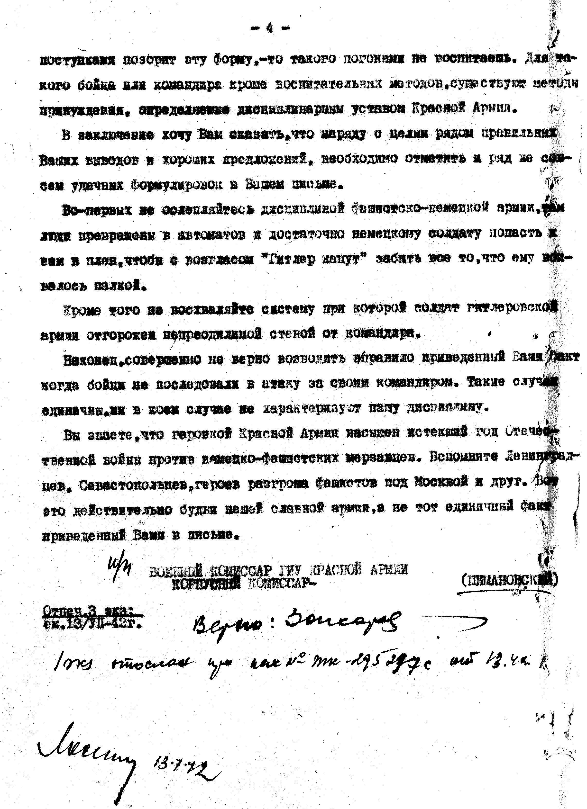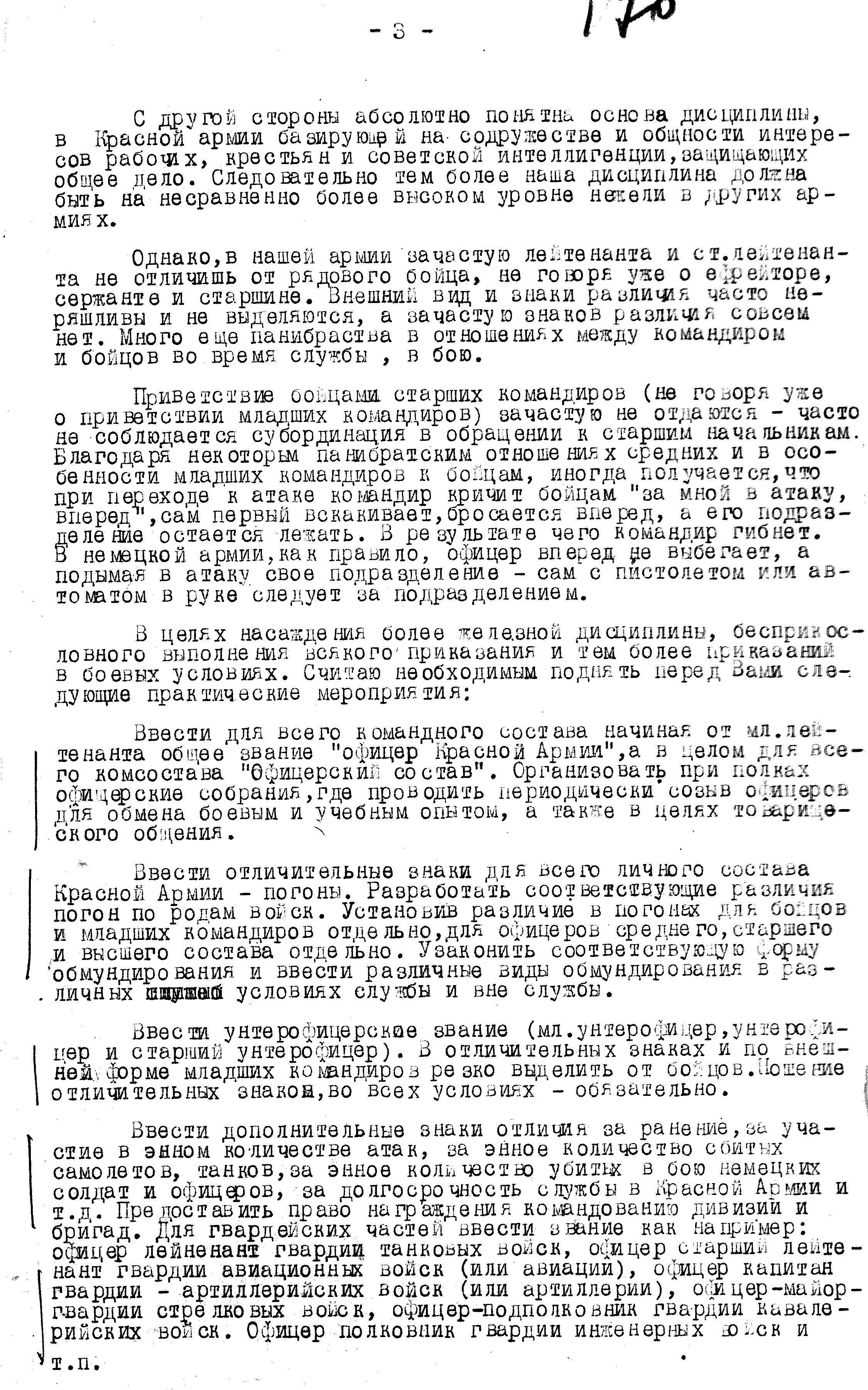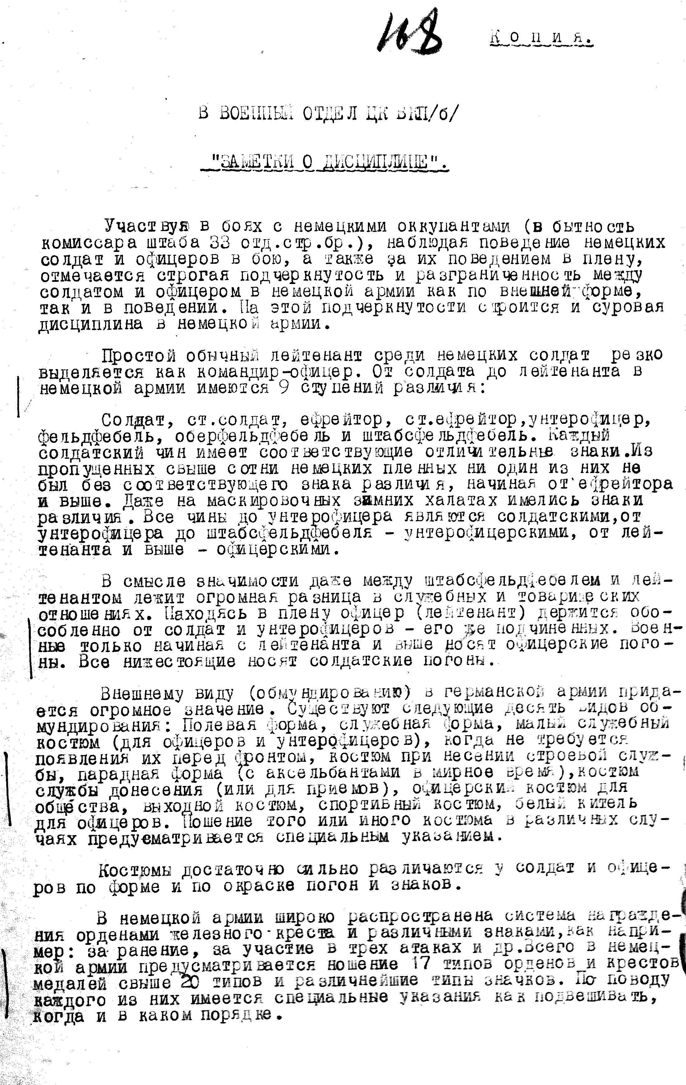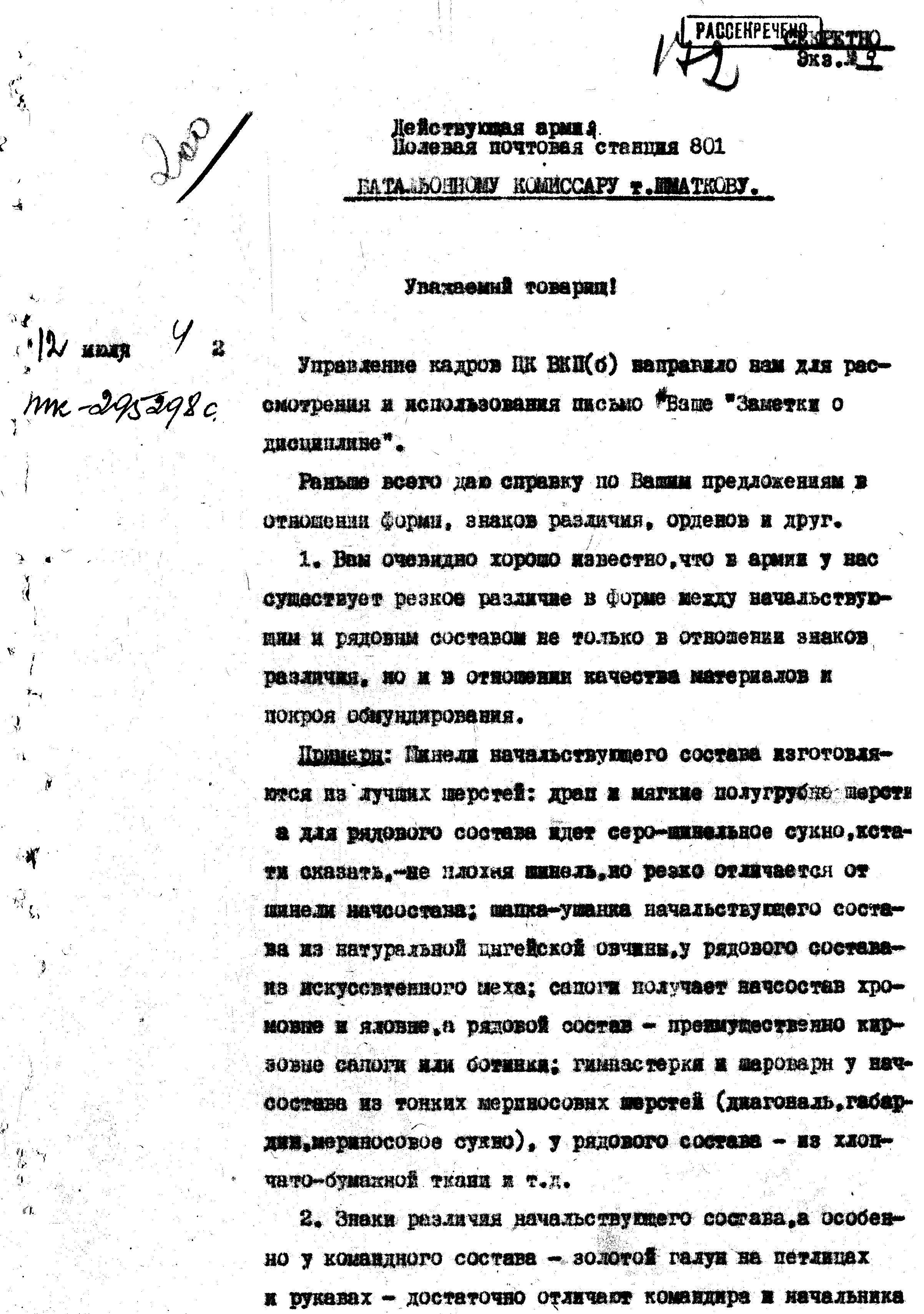 Среди многочисленных писем, с предложением о введением в Красной Армии погон, это обращение сразу привлекло к себе внимание. Не столько тем, кому оно адресовано, это как раз не редкость, и даже не тем, что оно отпечатано на пишущей машинке, а не написано от руки. Нет, заинтересовало именно содержание письма, уж очень сильно оно отличается от других, подобных. Необычно и неожиданно в нём то, что автор, обращаясь в 1942 г. в военный отдел ЦК ВКП (б), половину письма посвятил влиянию знаков отличия и различия на состояние дисциплины в гитлеровской армии, при этом не поливая немцев чёрной краской.
