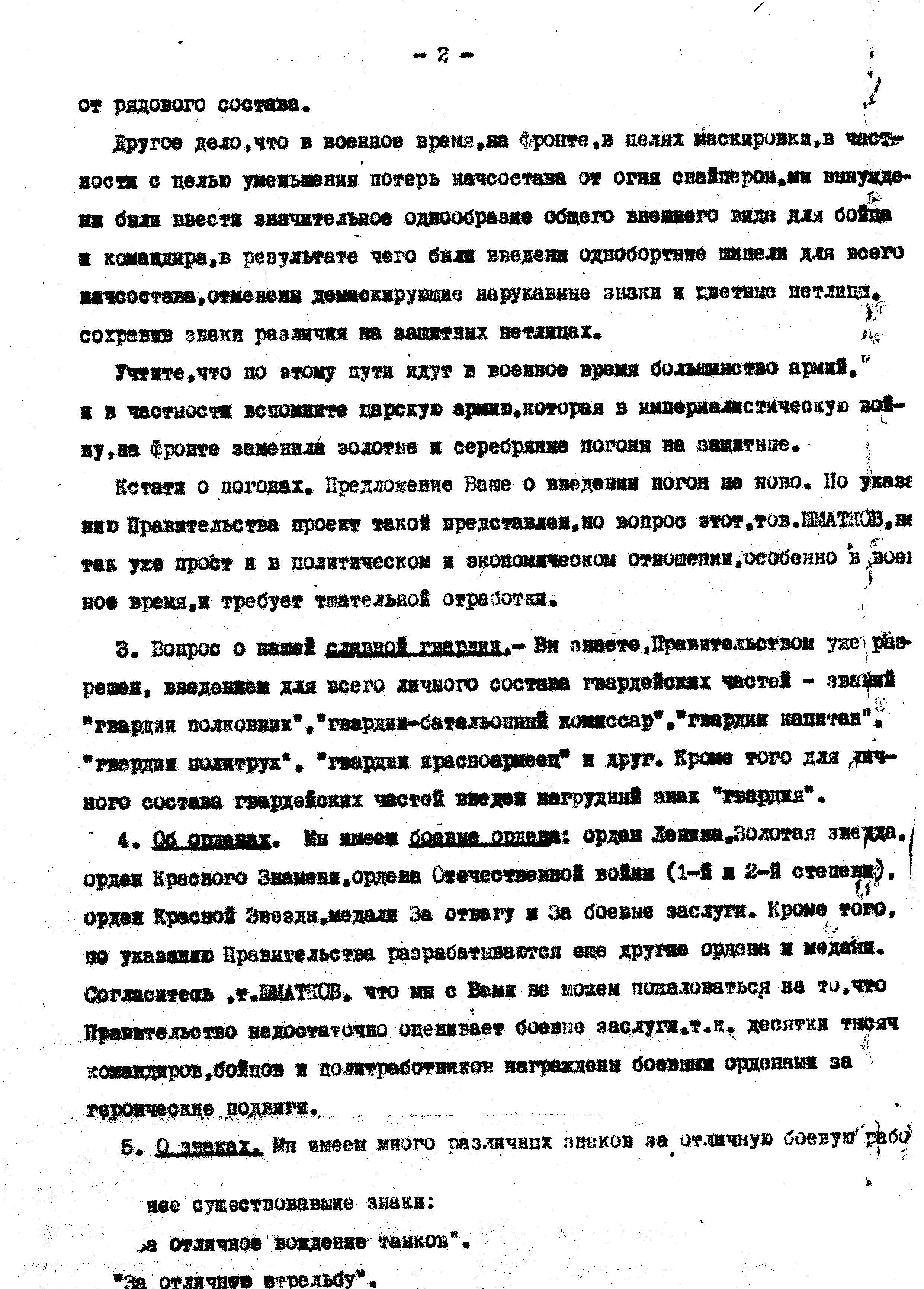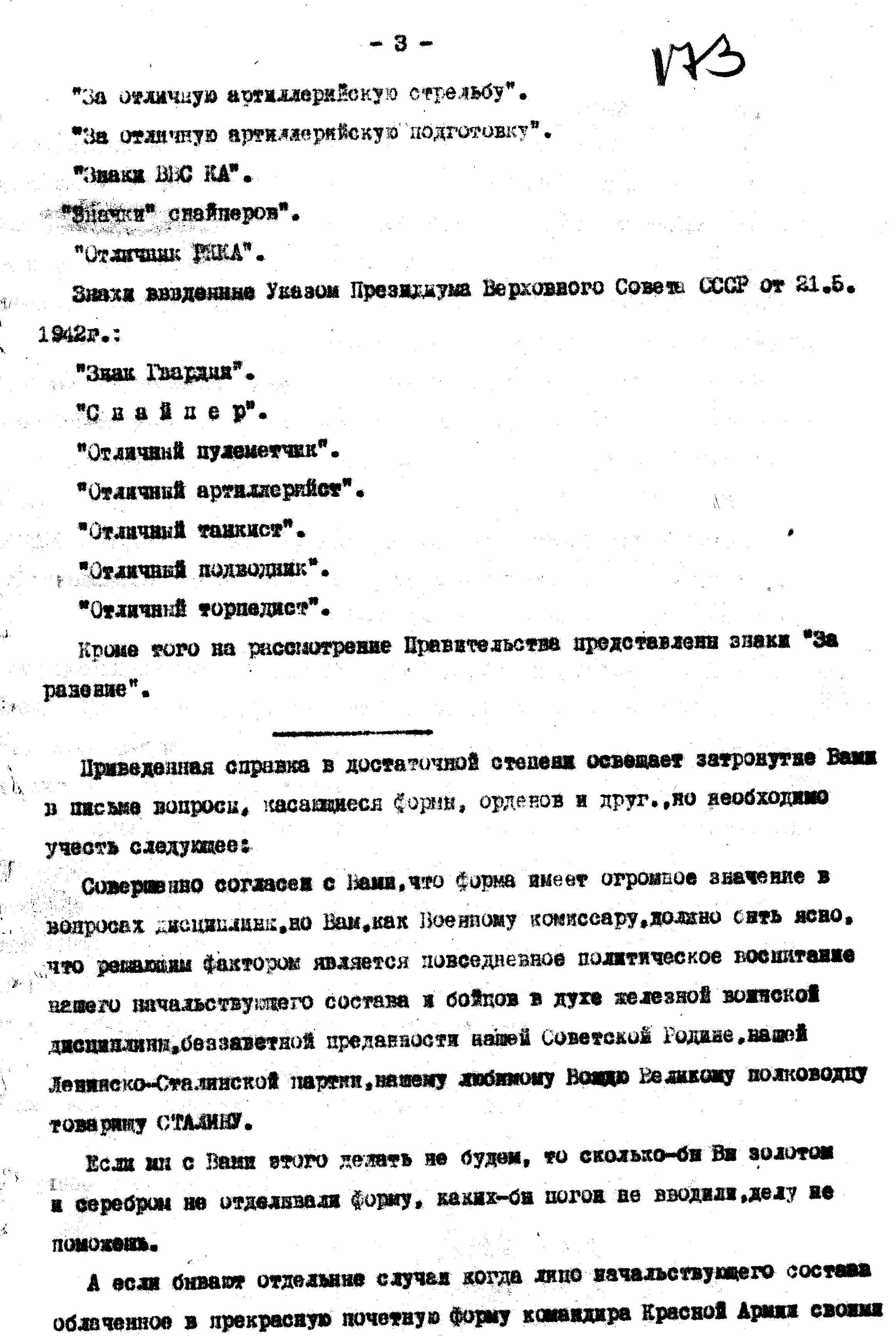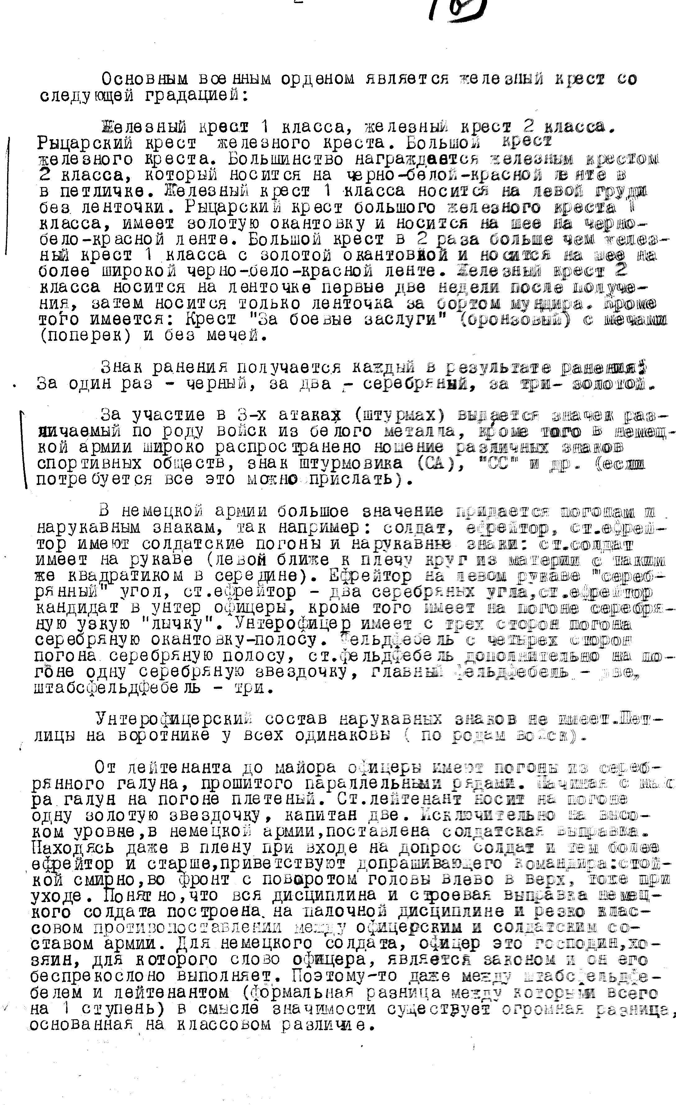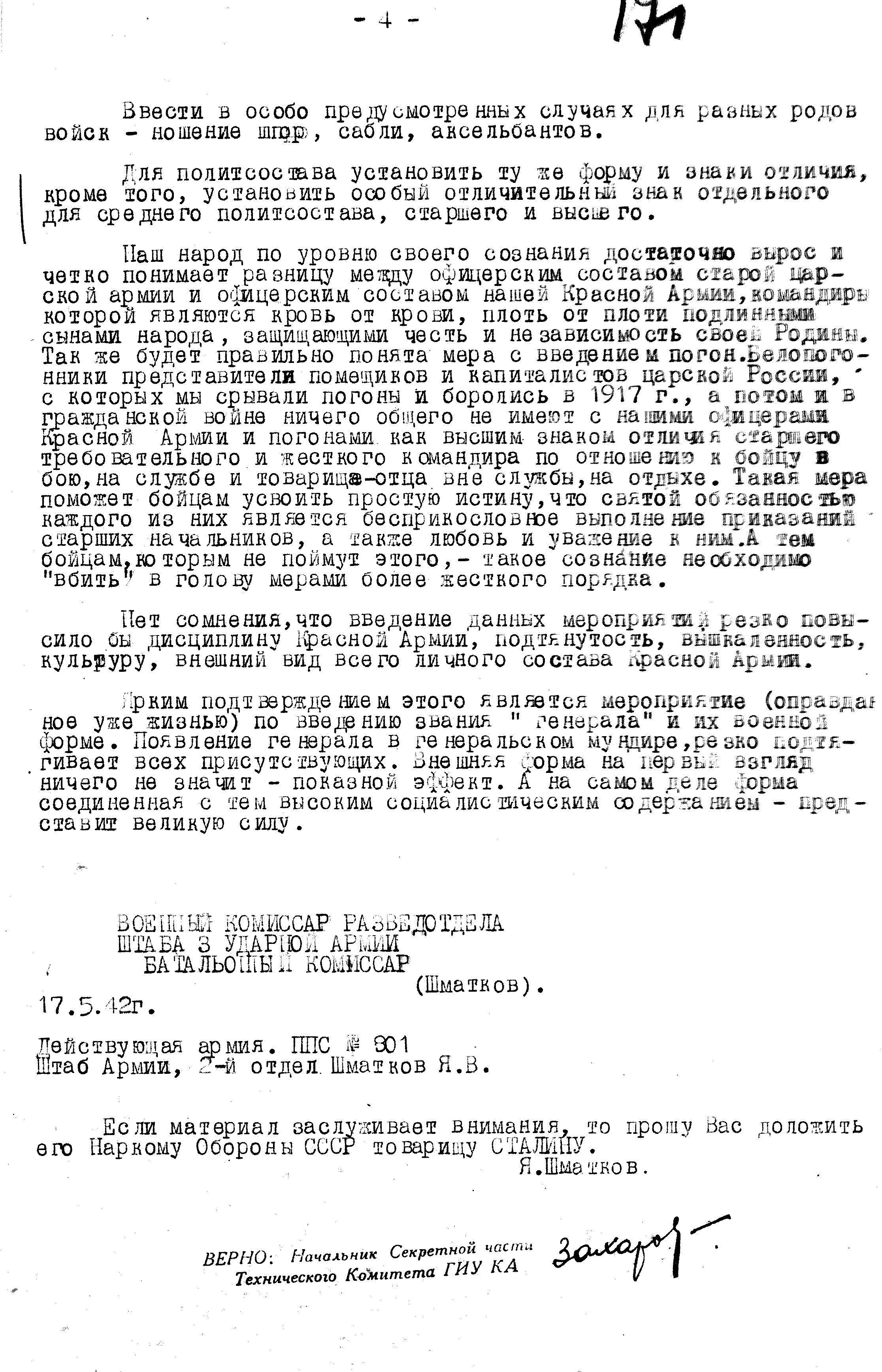 Сохранился в архиве и ответ ГИнтУ. Несмотря на то, что в это время уже велись активные работы по введению погон на снабжение всего личного состава Красной Армии, основной акцент сосредоточен не на них. А о немцах и влиянии знаков различия на состояние дисциплины в гитлеровских войсках, в ответе отведено пару абзацев: