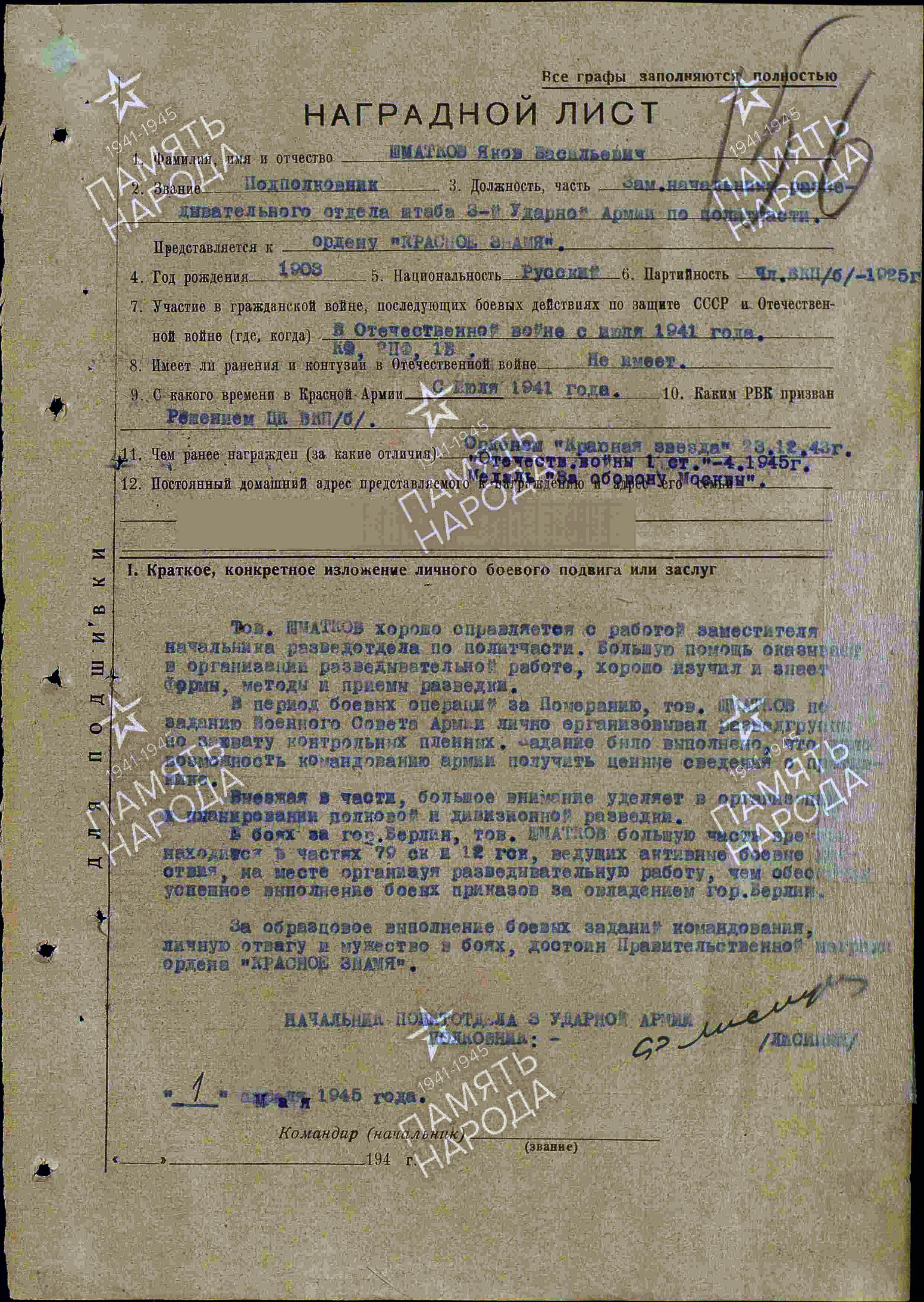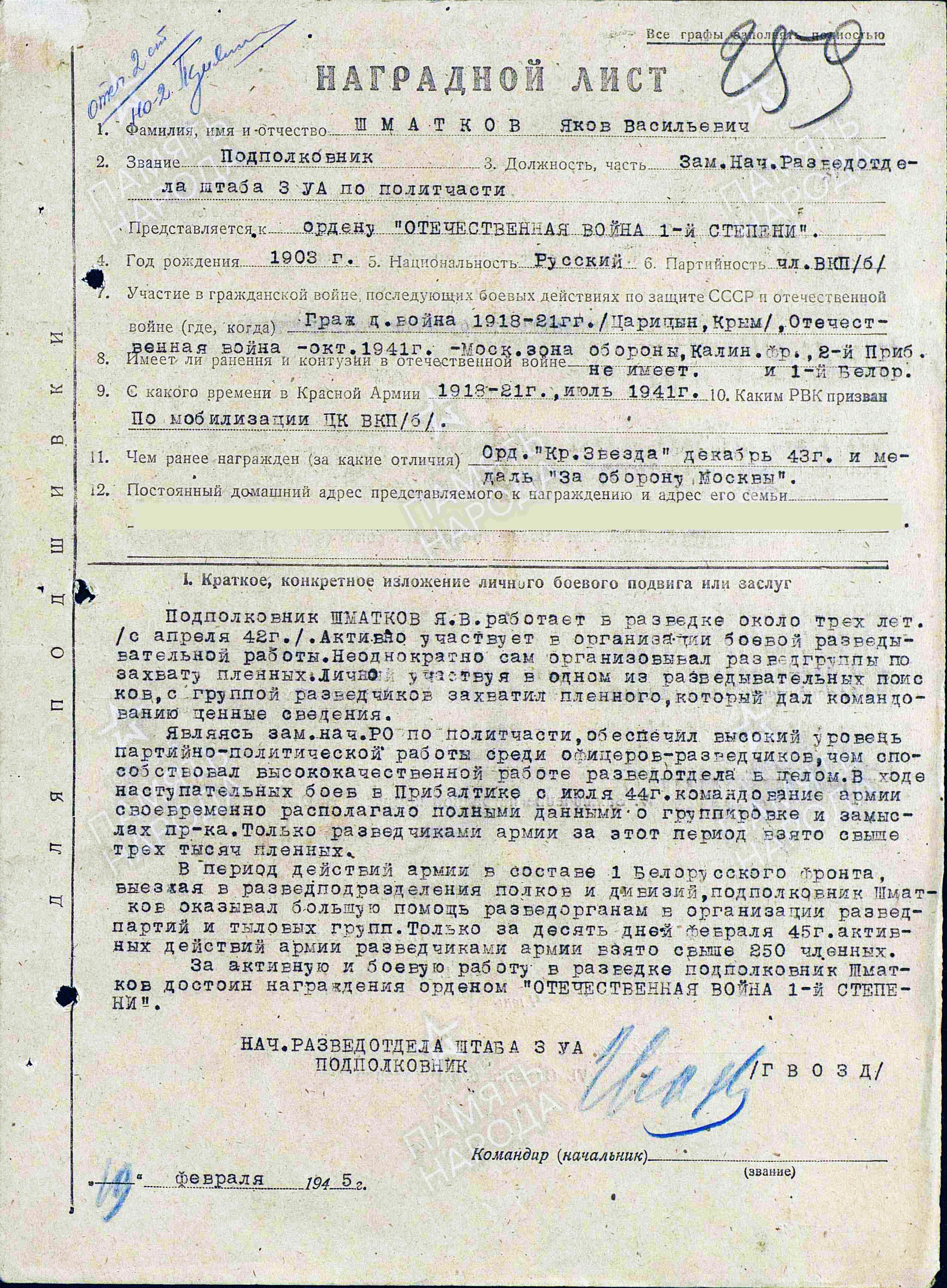 На самом деле, ничего подобного с автором письма не произошло. И хотя фотографии Якова Васильевича найти не удалось, на сайте "Память народа" выложены его наградные документы. Из них стало известно, что я. В. Шматков с 1918 г. по 1921 г. участвовал в Гражданской войне, оборонял Царицын, особождал Крым. На фронтах Великой Отечественной - с июля (по другому наградному - с октября) 1941 г., участник обороны Москвы:
