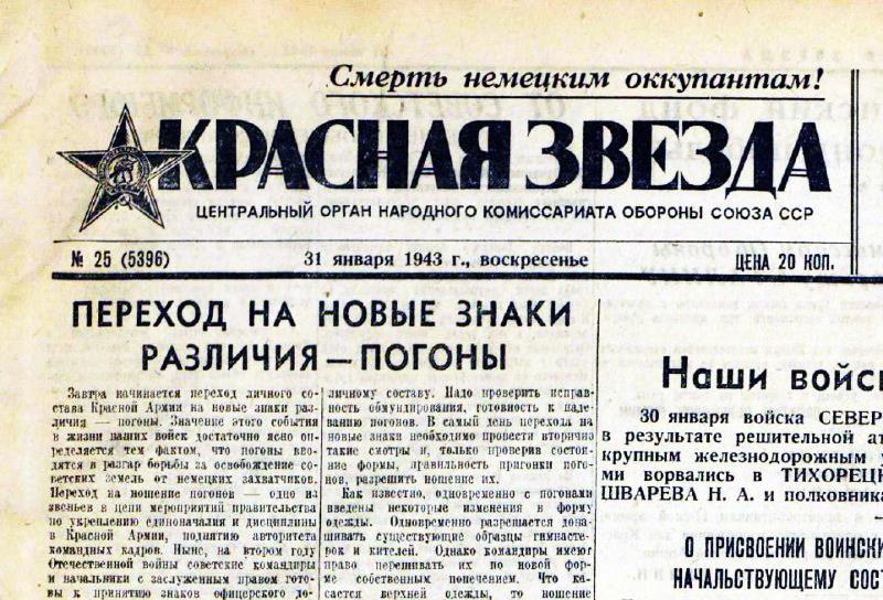 31 января 1943 г. в передовице «Красной звезды» есть такие строки: «Переход на ношение погонов — одно из звеньев в цепи мероприятий правительства по укреплению единоначалия и дисциплины в Красной Армии, поднятию авторитета командных кадров. Ныне, на втором году Отечественной войны советские командиры и начальники с заслуженным правом готовы к принятию знаков офицерского достоинства. На полях современных сражений наш офицерский состав, наши военачальники утвердили свою репутацию первоклассных военных организаторов и командиров. Внешние изменения в форме войск еще ярче оттенят это новое качество советских воинов.».