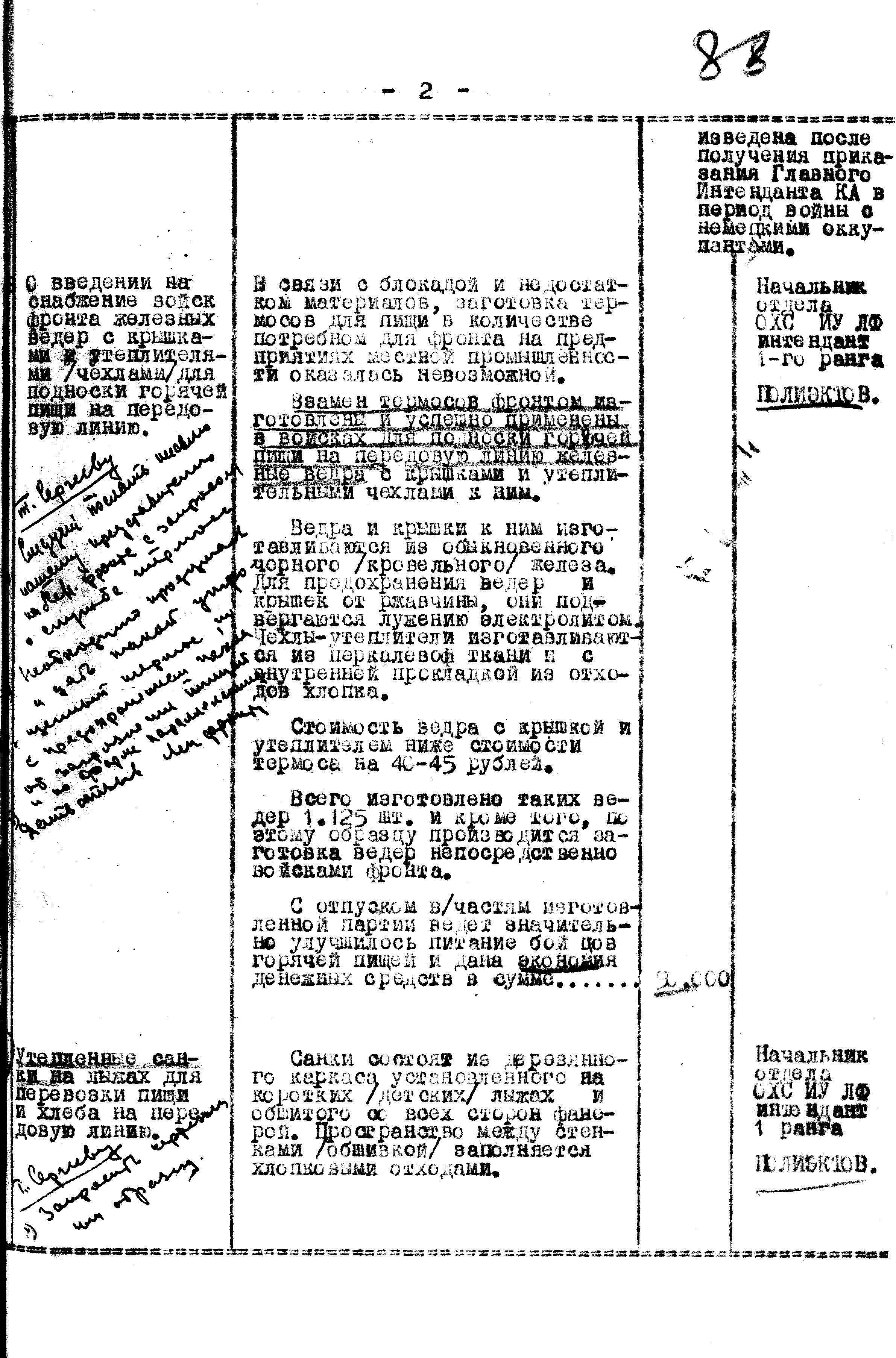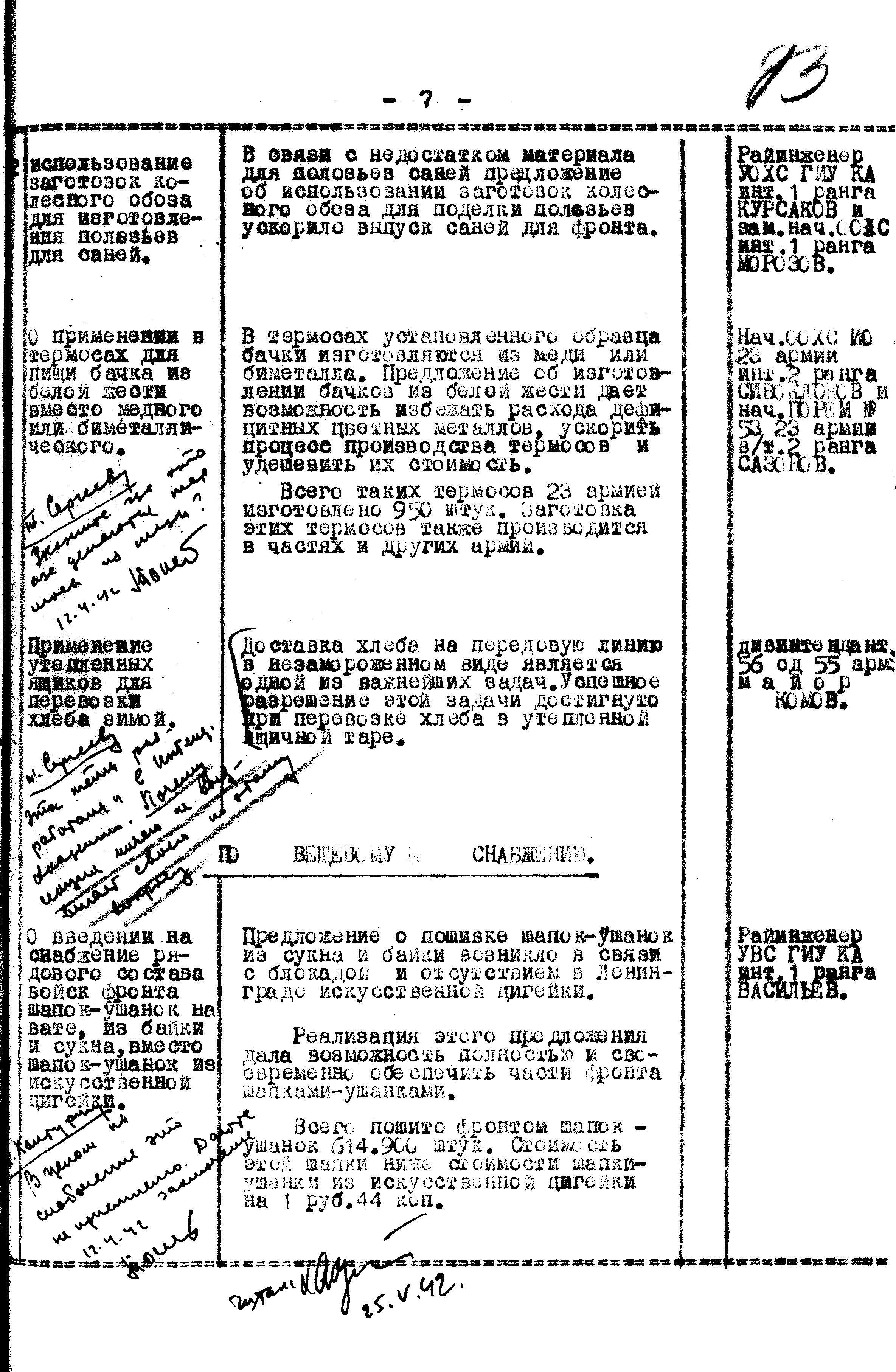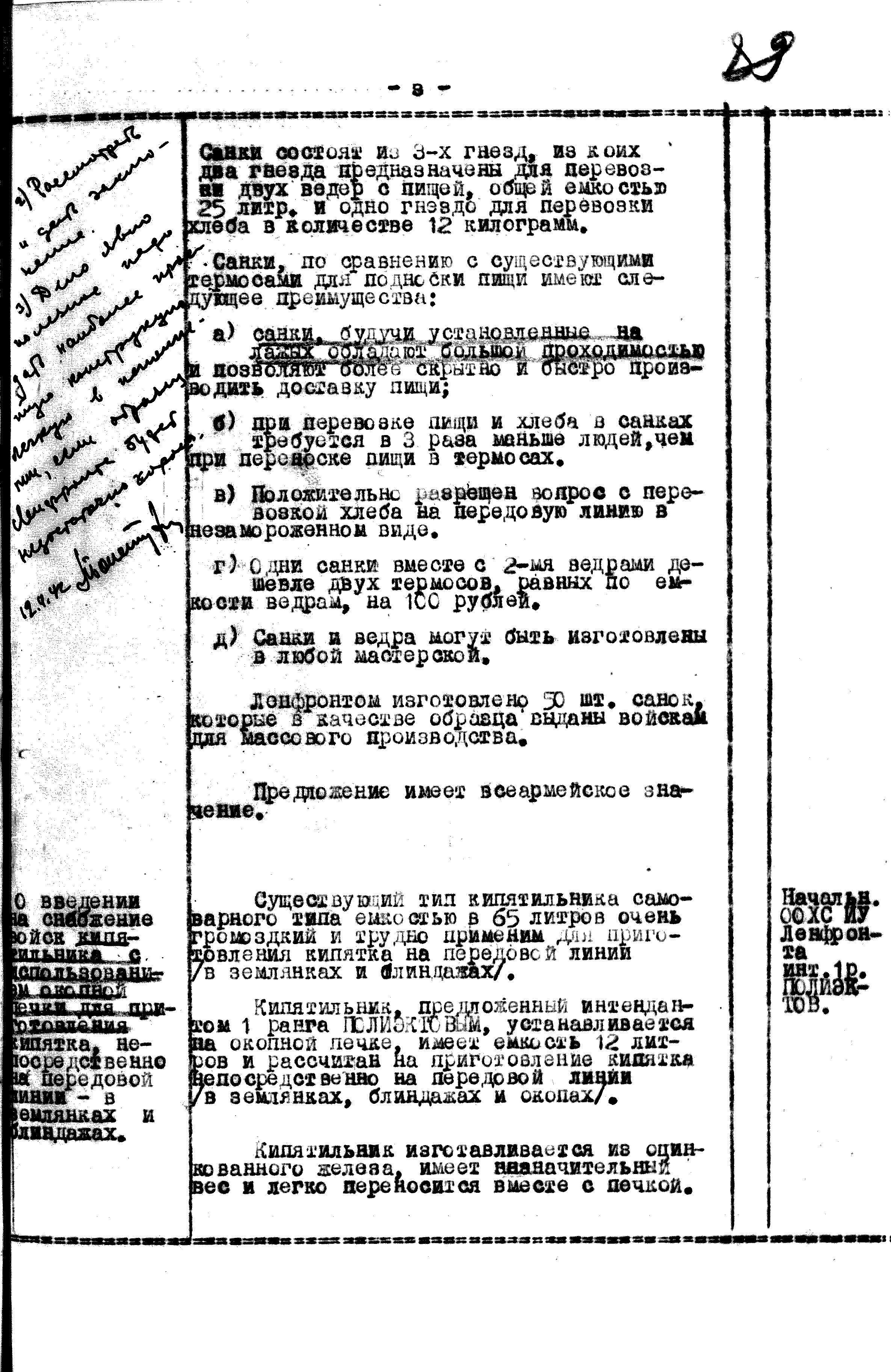 Именно ему и принадлежит предложение, по применению утеплённых ящиков для перевозки хлеба зимой. Этот вопрос оказался настолько важен, что рядом с предложением, стоит жёсткая резолюция одного из руководителей ГИнтУ о срочной доработке этого вопроса и разработке указаний войскам.