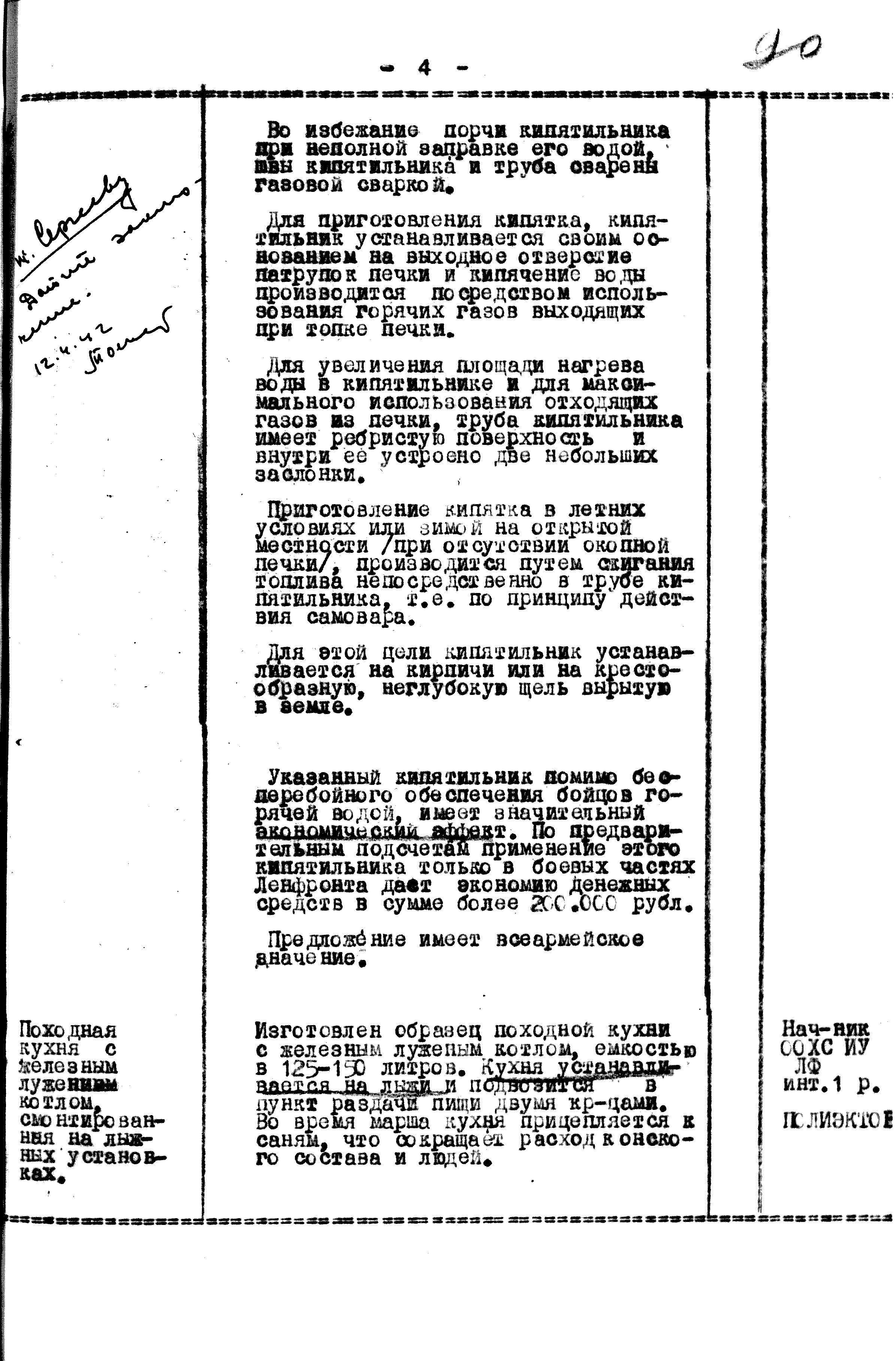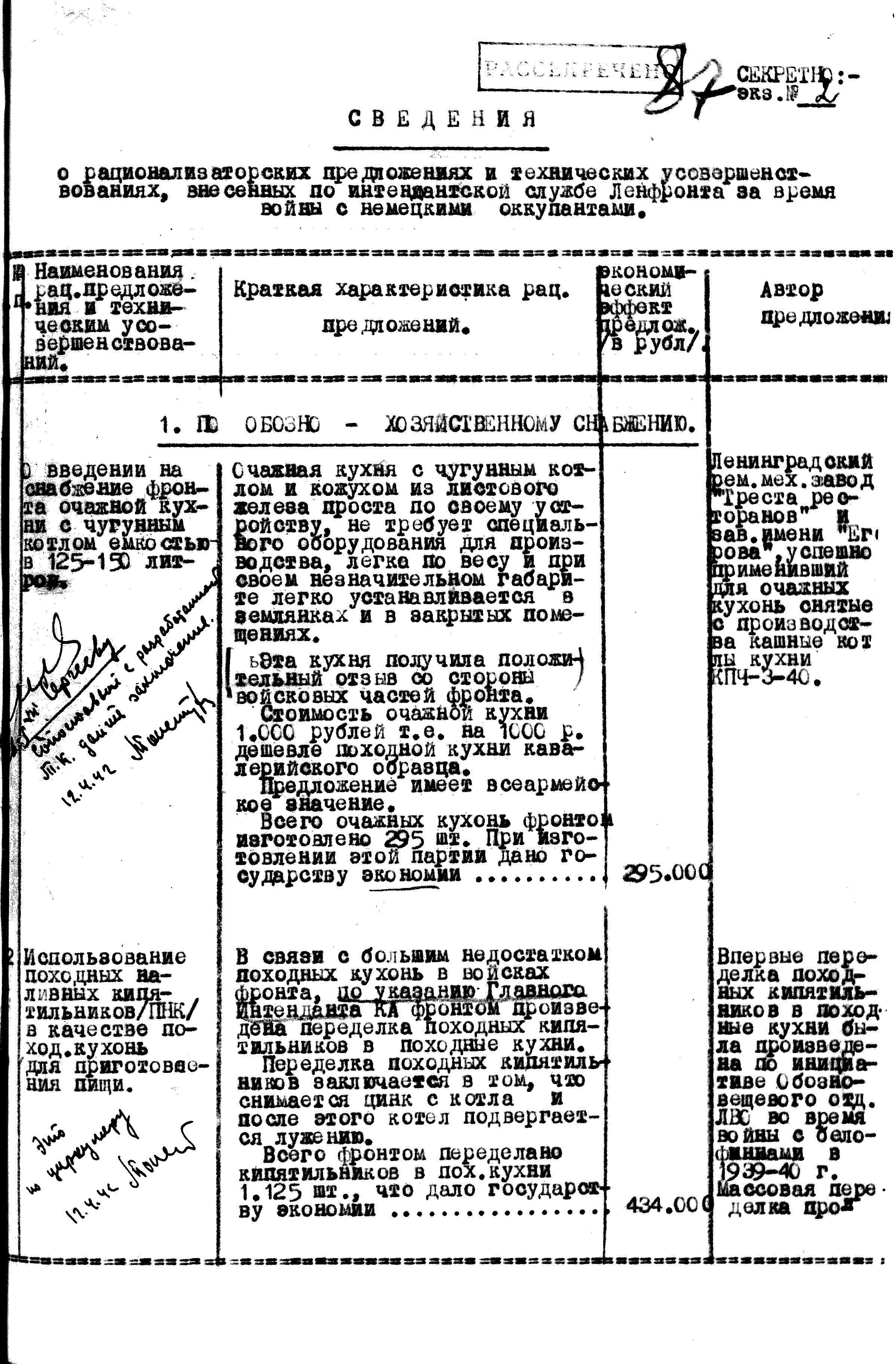 Сегодняшний рассказ будет посвящён не столько самим рацпредложеням и усовершенствованиям, внесённым в дни и месяцы блокады Ленинграда предприятиями и начсоставом интендантской службы Ленинградского фронта, сколько людям, создателям, изобретателям, рационализаторам. Людям, которые в условиях голода, бомбёжек, артобстрелов и непрерывных боёв, продолжали творить.