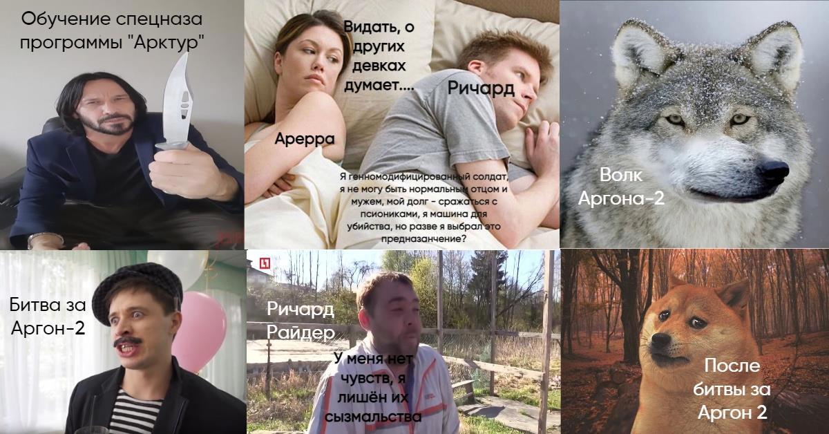 3. Шутки про волков. Особый отряд "Арктура" - "Стая" был послан на планету Аргон-2 где закосплеил мемы про шлёпу и его военные преступления над валькирианским населением колонистов. Из всего отряда в живых (после разбирательств и трибунала) выжил Фей Берну - пилот лучший друг Рика и сам Рик, получивший среди бойцов погоняло: Волк, а потом и "Бирюк", за то, что воспитал самую настоящую стаю. Волком Аргона-2 стал зваться из-за преступления своей команды и последовавшей расправой, которую сам и учинил. В цирке не выступал, но говорил эпичные фразы: "Если волк молчит, его лучше не перебивать" - придумал именно он, да.
