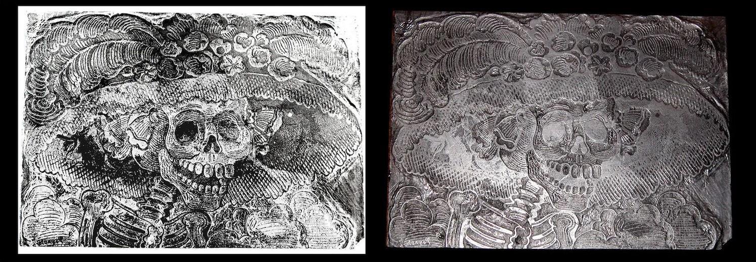Печатная форма La Calavera Catrina. Слева: приблизительная виртуальная пластина. Справа: Печатная форма для кислотного офорта работы Посады. Предоставлено коллекцией Брэди Никаса. Источник: Posada Art Foundation