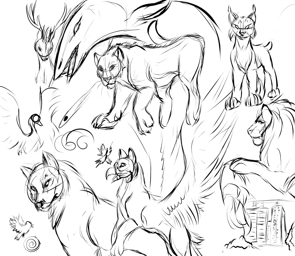 Автор: К.С.Н.Почти дописала финал "Крыльев Ориенты" и наскетчила к нему всяких своих зверей. Вне контекста это просто скетчи кошачьих, волка, грифона, оленя и некоей хтони. Правда, основанной на реальном существе.