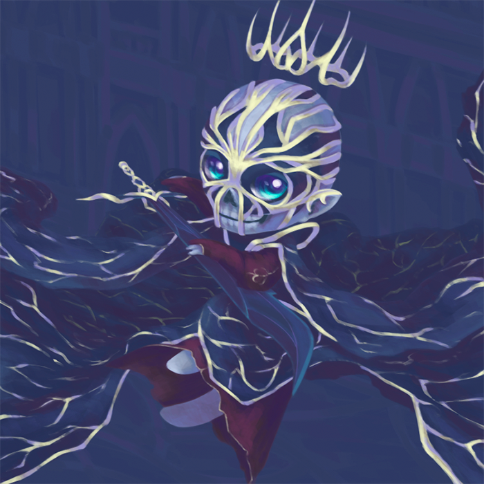 Кащейчик летает под потолком огромного помещения - скорее всего, какого-нибудь зала своего мрачного замка. Внизу виднеется кусочек пола и кусочек стены с аркой. В принципе, фон не был обязательным элементом изображения, но он добавил ему глубины и "связанности" с историей.