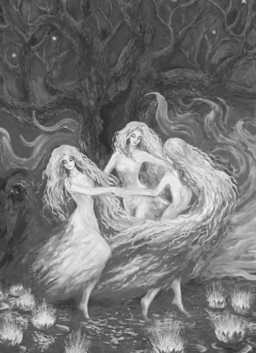 | 26/31 ЗА ТВОЕЙ СПИНОЙ На Русальной-то неделе В хороводе мавки пели, Потеряв покой: «Меня мама породила, Некрещенну схоронила. Ой, да люли, ой». Все в цветах, в сорочках белых, Голосят средь пней замшелых В тишине ночной: «Со спины я отворенна И водой не освященна. Ой, да люли, ой». Уж к заре подходит время, И стихает мавье племя В глубине лесной. Звуки флейты ослабели, Красные огни бледнели. Ой, да люли, ой. Коль услышишь мавки пенье, Прочь беги от наважденья За твоей спиной. Если встретят — защекочут, Мавки до забав охочи. Ой, да люли, ой. 26.10.2022 | ![]() |