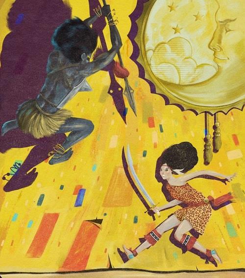 Гаргиль уже был на совесть выкрашен в черное — почти весь, не считая ног, одетых в цветное трико. Но метаморфозы неумолимо продолжались: он подкрасил себе брови и рот чем-то золотым из маленькой баночки, нацепил на руки и на ноги браслеты с бубенчиками, подвязал мочальную юбку и надел нечто вроде кирасы с двумя выпуклостями на груди, напоминавшими аптечные воронки. Наконец, водрузил себе на белобрысую голову черный парик, из которого торчали раскрашенные перья. Ибо он был не только доном Пафосом, но и королевой Африканской.