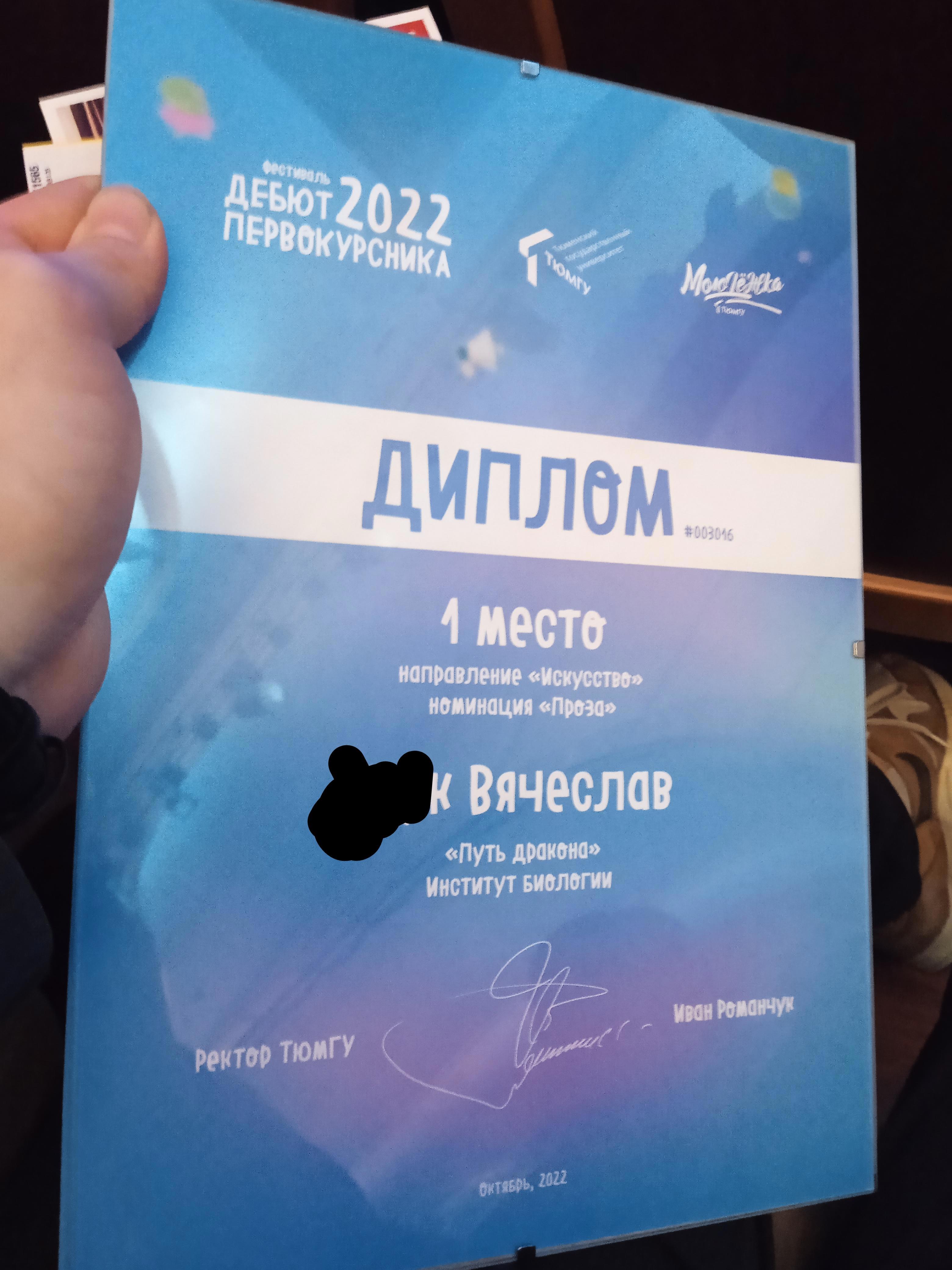 Шëл я на этот концерт, понимая, что и меня могут наградить... Я понимал это... конечно, желал... Но вот дело доходит до объявления победителей в номинации "проза". Меня начинает немного колбасить (не люблю это), и я начинаю себя унижать. "Да успокойся ты, ничего не выиграешь. Ну с кем ты собрался состязаться? Вон, соцгум наотправляет своих гуманитариев и всë. Нет у тебя шансов, успокойся". Но вот объявляют третье место, выходит девочка с инзема, живëм в одной общаги, кормила меня мëдом... Потом второе место... И я опять "ну вот видишь, не третье и не второе, первое тебе точно не дадут. Всë". И я пытаюсь абстрагироваться от этого мира... но низкое желание услышать в динамики свои имя и фамилию поглощает меня... И... я их слышу. Охуеваю я. И охуевают все. Никто не знал, что я отправлял свои рассказы (только куратор творчества, потому что она заявку отправляла). Наши оборачиваются ко мне, шокированные. Я поднимаюсь на сцену, гордо смотрю в зал... Перекинулся парой словечек с Варей (той девочкой с третьего места), довольный спустился на своë место. Наши в ахуе, как так, да ты чë нам не сказал... А потом концерт закончился... Мы встретились с нашими любимыми кураторами, которые сидели на задних рядах... Они тоже офигевали... Тоже не знали... Все были рады. Биофак вообще много где засветился, раньше он всегда был в самом хвосте, а теперь мы показали себя. Да, нас мало, но мы кричали, хотя и не перекричать нам игип, хотя и кричать-то мы не любим. Да, у нас не было финансирования, но мы выступили и выступили хорошо. Взяли номинацию в театре и музыке, в моде, выиграли ЧГК и мультиигры... Мы молодцы.