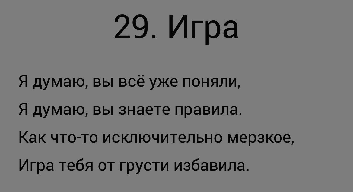 П.П.С. Рекомендую подписаться на хорошего поэта: https://author.today/u/koktelivamaria (знакомы лично, и по независящим причинам стихи автор сможет публиковать только через несколько дней после третьего ноября, но всё-таки… нужно же как-то мотивировать? Тем более, с нынешними правилами АТ и всем, что связано с репутацией ниже ста). Заранее спасибо и спокойной ночи!