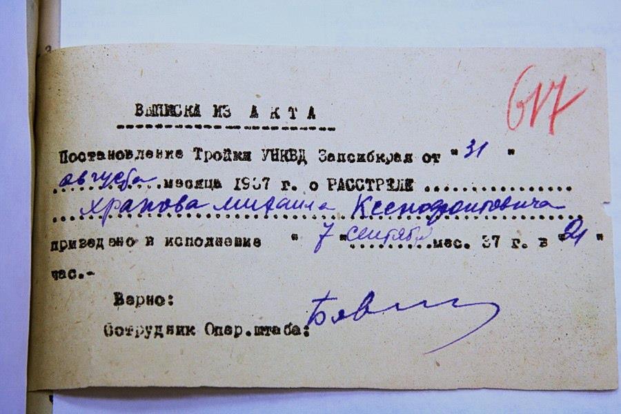 Во блаженном успении вечный покой, подаждь, Господи, усопшим рабом Твоим, во дни лихолетия безвинно убиенным, страдания и истязания претерпевшим, в изгнании и заключении горькую смерть приемшим, ихже имена Ты Сам, Господи, веси, и сотвори им вечную память».