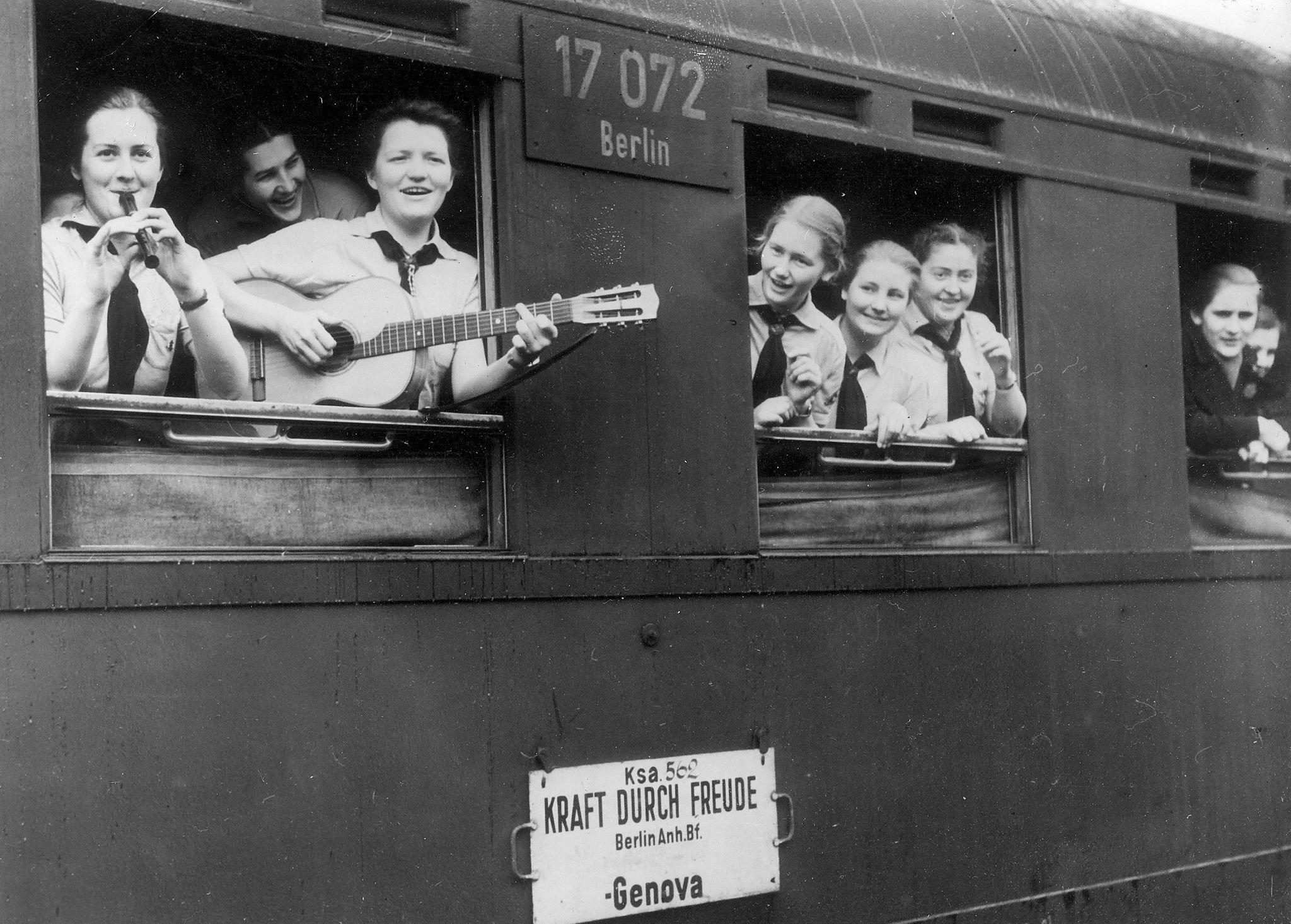 Туристки из "Союза немецких девушек", едущие в Геную на поезде турфирмы "Сила через радость!" - дорогие туры для простых людей.