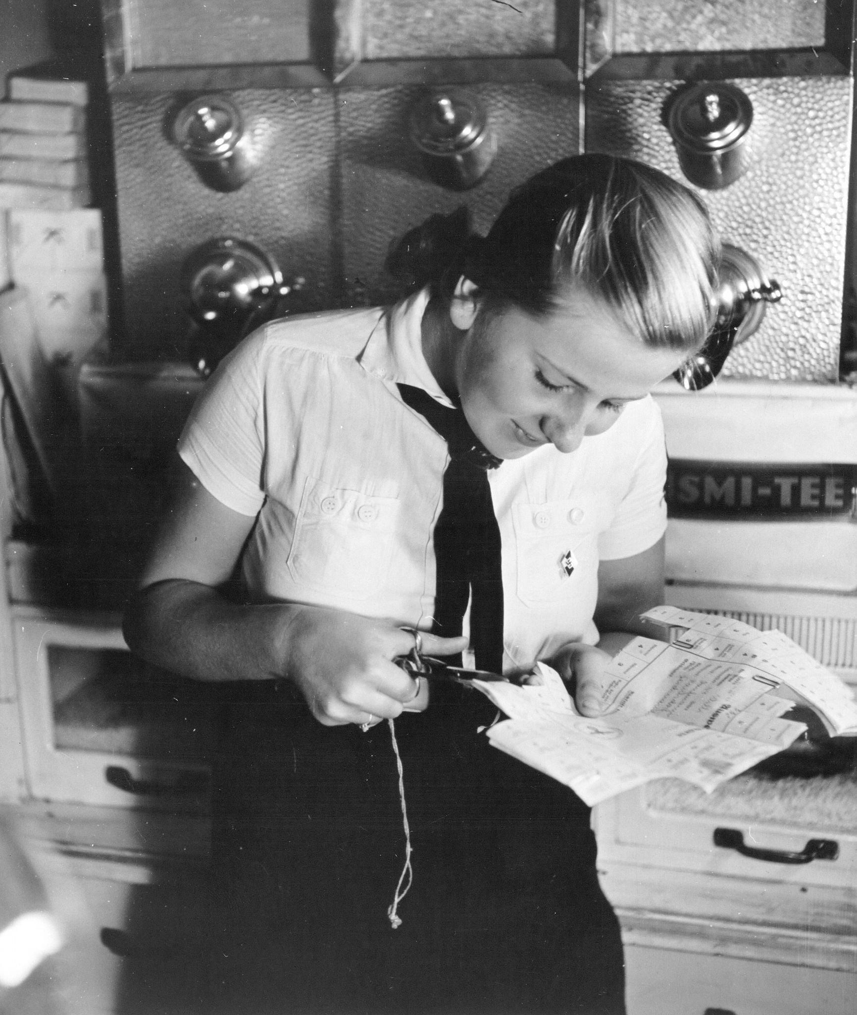 Девушка из "Союза немецких девушек" отрезает талоны на питание в столовой. В Рейхе уже карточное питание давно.