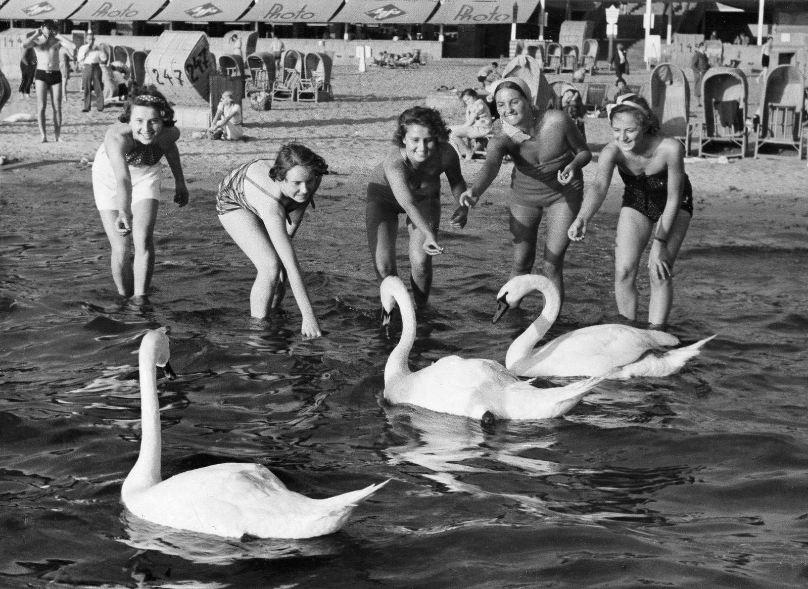 Немки кормят лебедей.