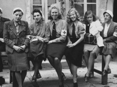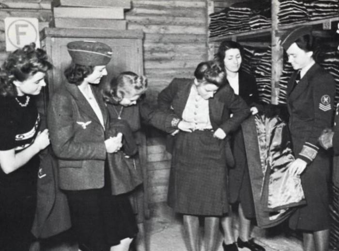 Получение униформы, как понимаю? Или наоборот сдача? Странный наряд у дамы справа, но вроде как орел на пилотке. Или англичанка?