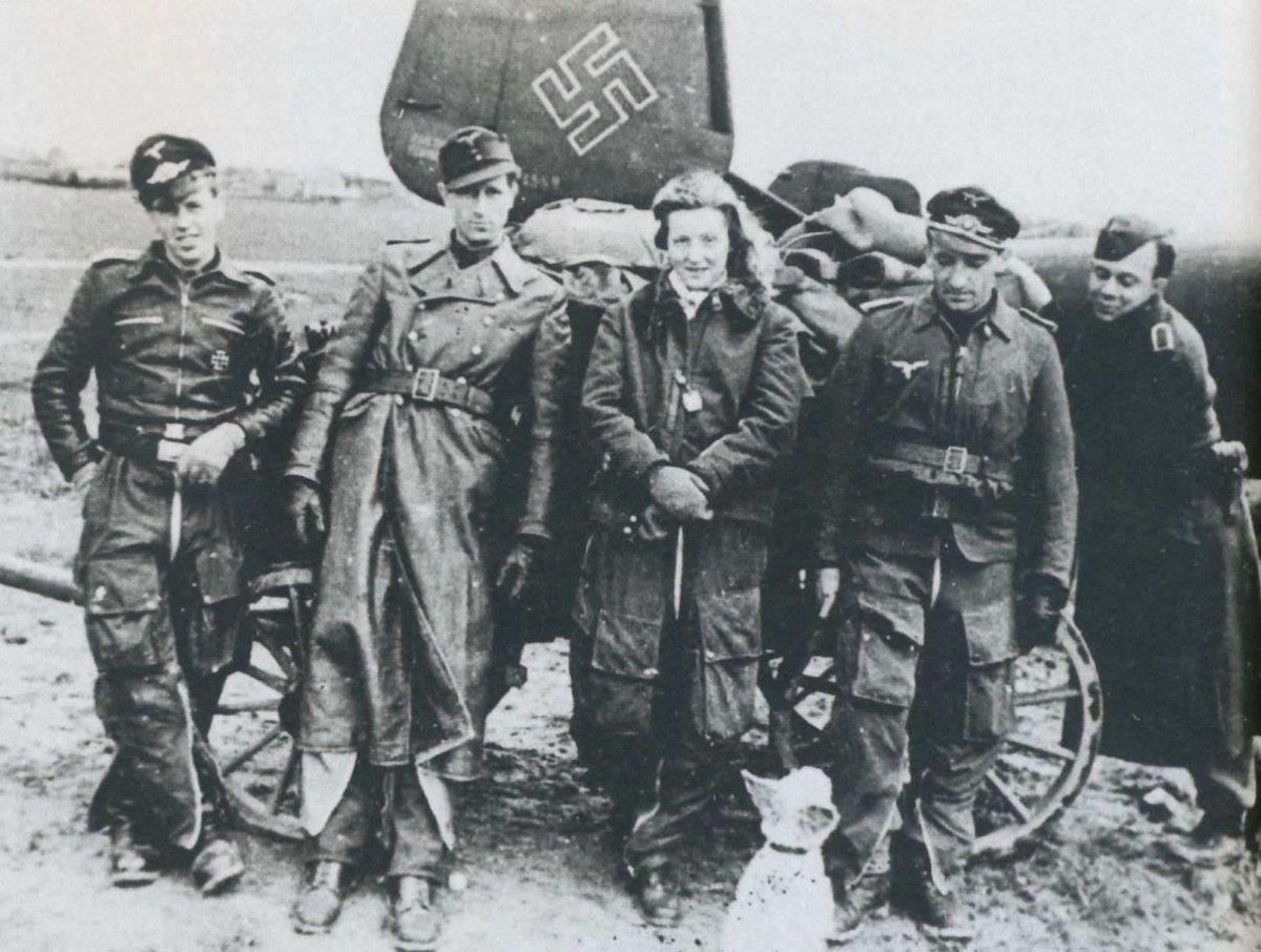 Одета в летный комбез - летчицы у немцев были, самая известная Ханна Рейч, но и кроме нее имелись. Попадалось в воспоминаниях - под Сталинградом ветеран видел разбившийся транспортник с мертвым пилотом - женщиной.