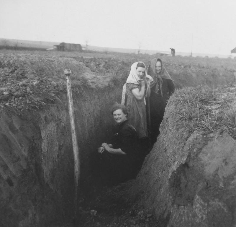 На земляных работах. Вроде в варальбуме пишут, что уже конец войны и они окопы наоборот засыпают.