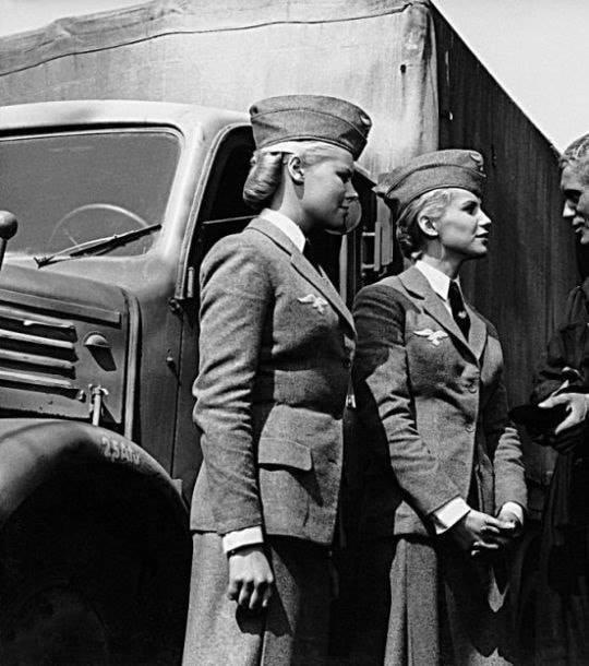Эти из вермахта. Вероятно связистки, хотя может быть кто угодно.