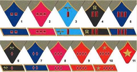 1-лейтенант (кавалерия), 2-старший лейтенант (пехота), 3-капитан (авиация), 4-майор (автомобильные части), 5-полковник (кавалерия), 6-комбриг (инженерные войска), 7-комдив (кавалерия), 8-комкор (пехота), 9-командарм 2-го ранга, 10-Командарм 1-го ранга, 11- Маршал Советского Союза.Командармы и маршалы Советского Союза цвет петлиц имеют не малиновый, а красный. Это связано с тем, что они находятся уже вне родов войск, поскольку армия в своем составе имеет все рода войск и служб. Корпус может быть стрелковым, кавалерийским, механизированным. А вот армия только общевойсковой. Танковые армии появятся в РККА только летом 1942, а саперные в декабре 1941.