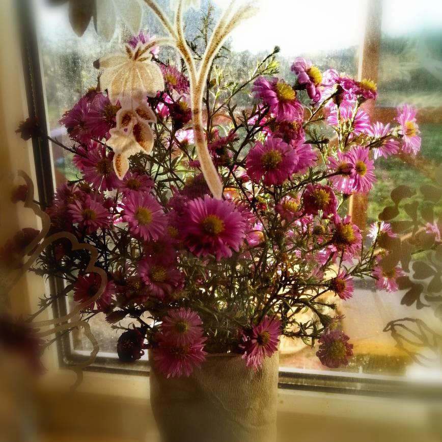 И один из последних в этом году букетиков. Он у меня на подоконнике стоит. За тюлевой шторкой.