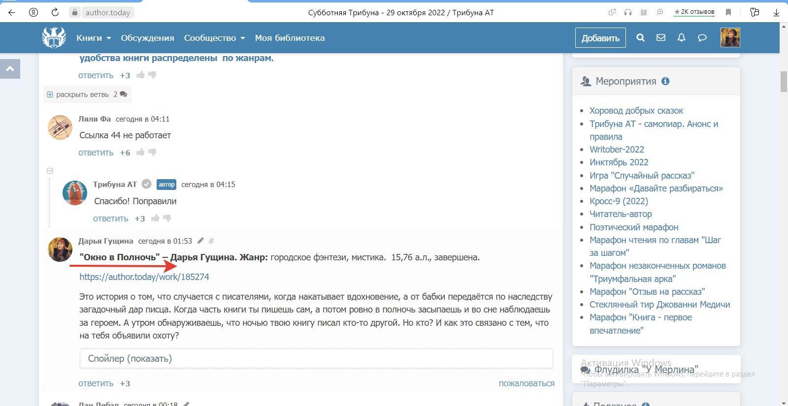 6. Самопиара ради я полезла на местную "Трибуну") Кто хочет поддержать (поставить лайк презентации книги, написать короткий отзыв или просто похвалить автора), то я тут: https://author.today/post/316698?c=16475963&th=16475963 (описание книги в комментах, ищите, пока моё "Окно в Полночь" сверху) Буду очень признательна за поддержку, да) Она имеет значение для попадания книги в топ "Трибуны АТ".