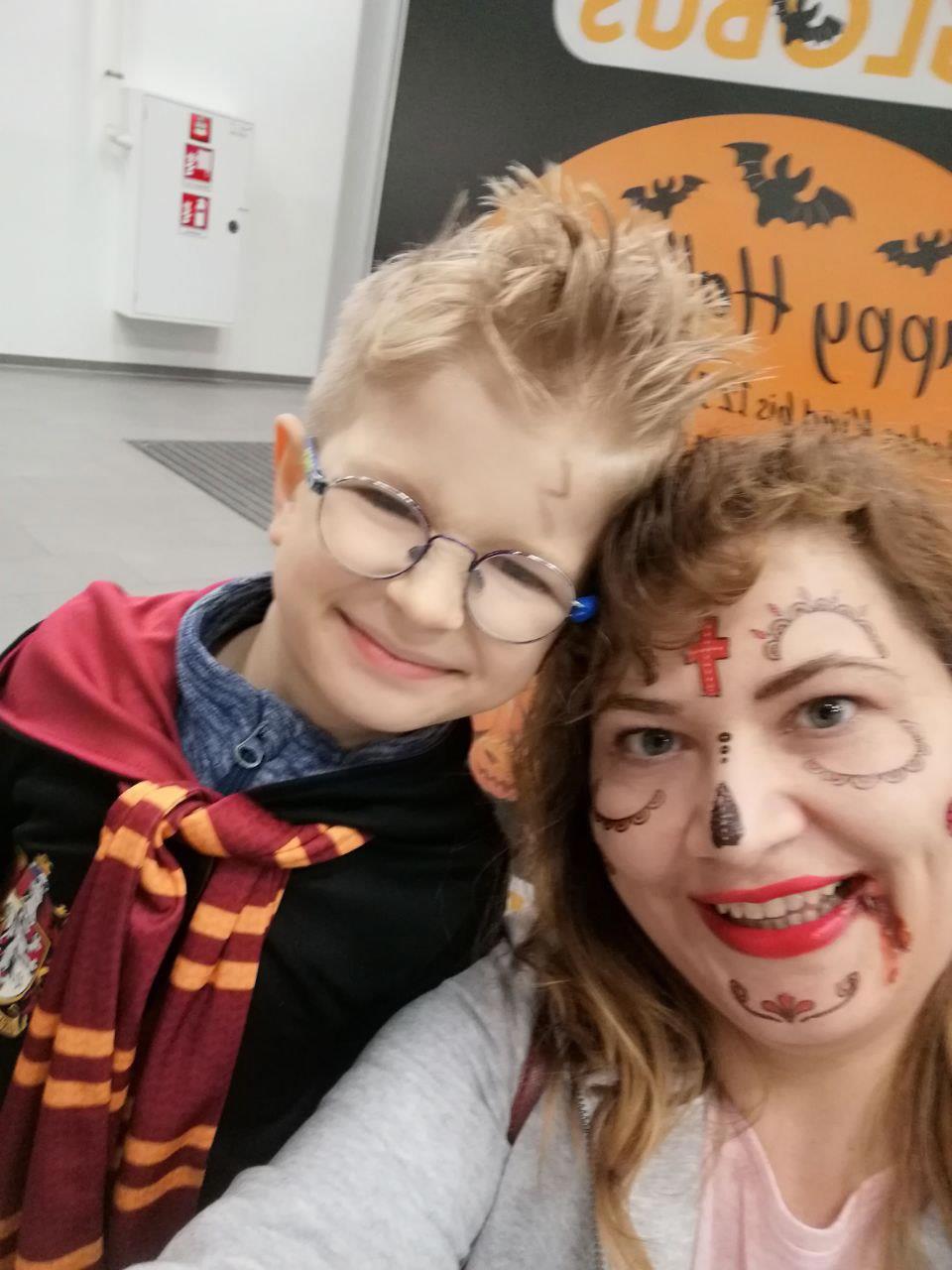 На неделе наш супермаркет объявил об акции, все дети до 12 лет, которые придут 31го октября в маскарадных костюмах получат сладкие подарки. Мы решили, что раз уж нам все равно идти - нет повода не получить конфет. Костюм Гарри Поттера еще на прошлый маскарад покупали. А мама - у нее всегда целая косметичка в запасе. Самое забавное, что проходя мимо вокзала мы стали самыми внушающими доверие прохожими и помогли дедушке, забывшему очки купить билет.