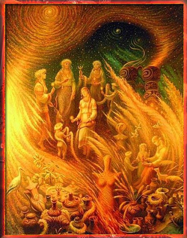 И течет та река времени сын мой, растрачиваясь, и нынче вечны предки наши. И увидим Пращуров своих и матерей которые уже в Сварге, и там стада свои пасут, и жатву свою жнут, и жизнь имеют, и ждут нас. Там нет ни Гунов, ни Эллинов. Правь, княжит там, и та Правь есть истина, так как Навь (темная Навь-Пекло) совлечена ниже Яви (не в смысле пространства, а энергетически), и это дано Свентовитом и пребудет так во веки веков…