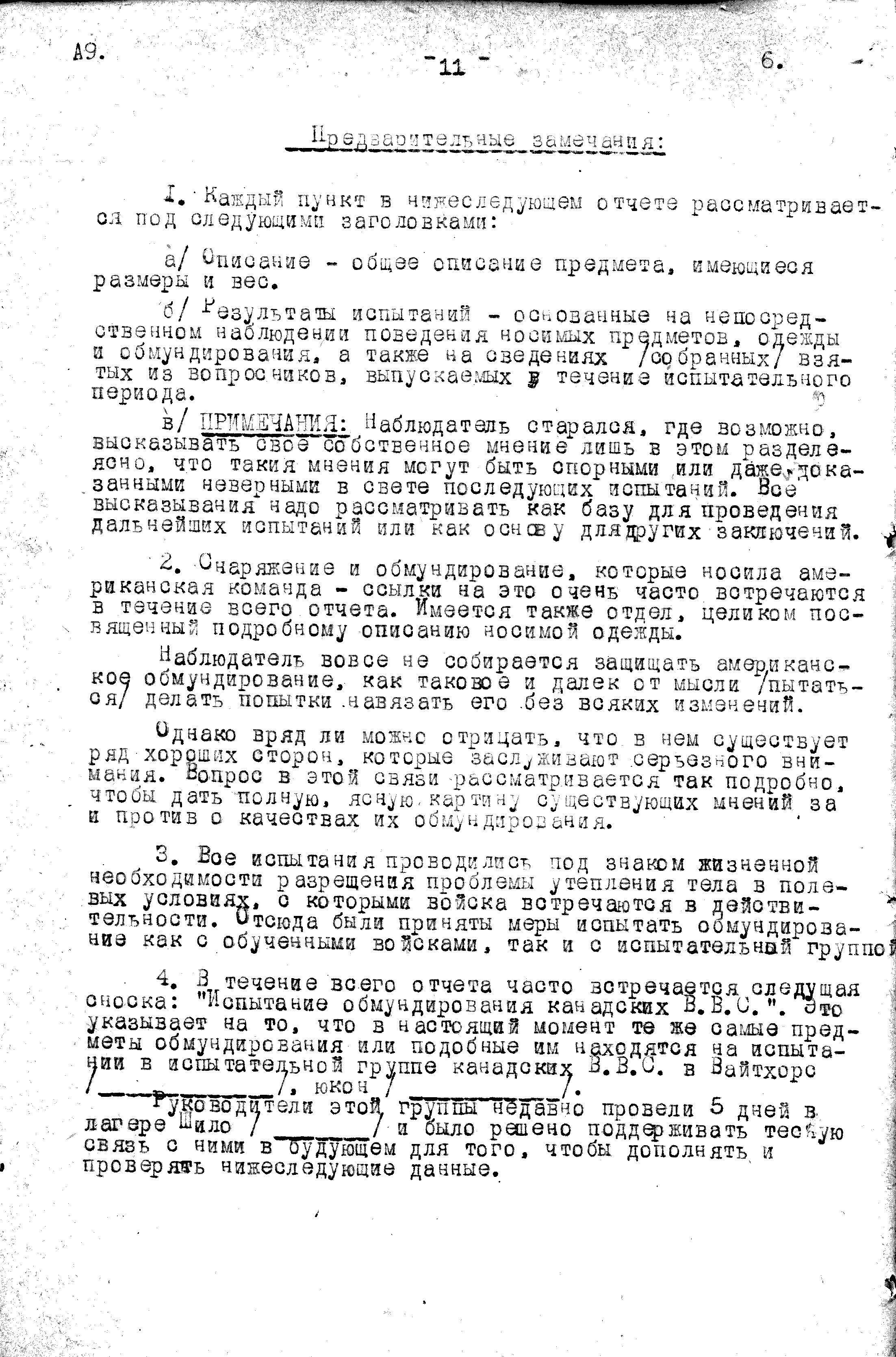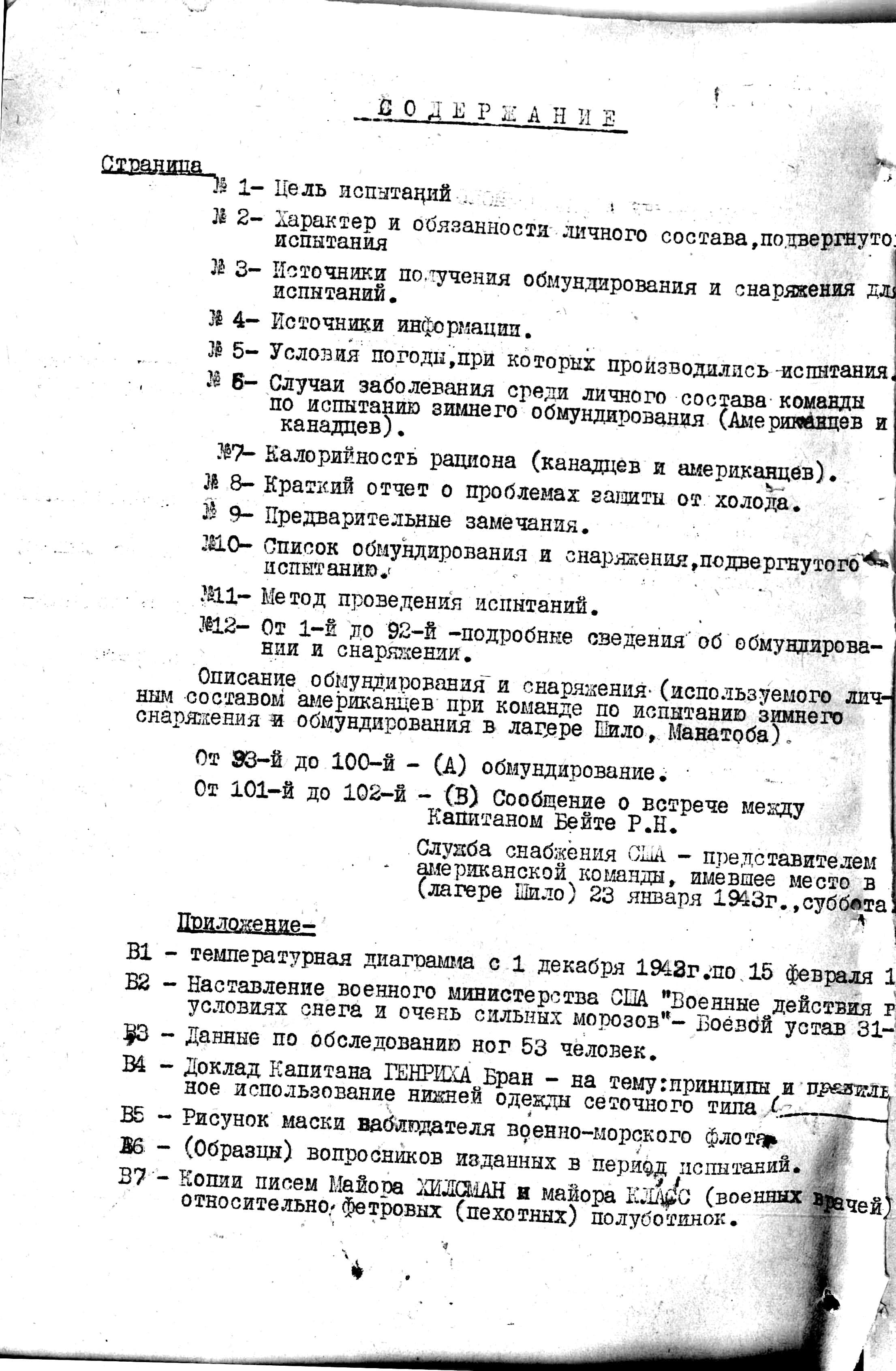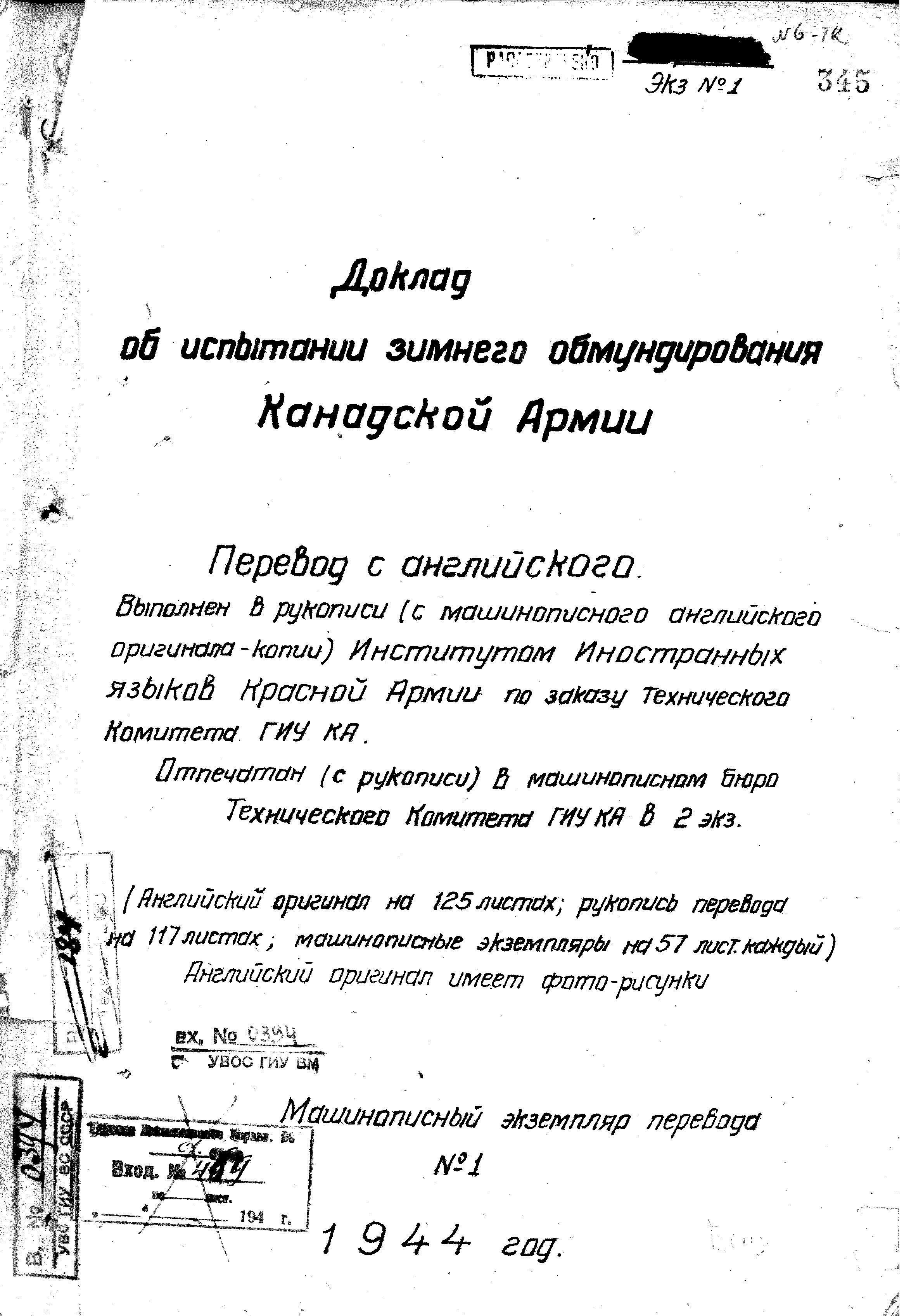 В 1944 г., в Главное Интендантское Управление, официальным путём, поступил "Доклад об испытании зимнего обмундирования Канадской Армии". Документ был отлично, по тем временам, проиллюстрирован фотографиями и рисунками. Скорее всего, это был своеобразный рекламный ход, призванный убедить Советское Правительство, расширить ассортимент закупаемой продукции.