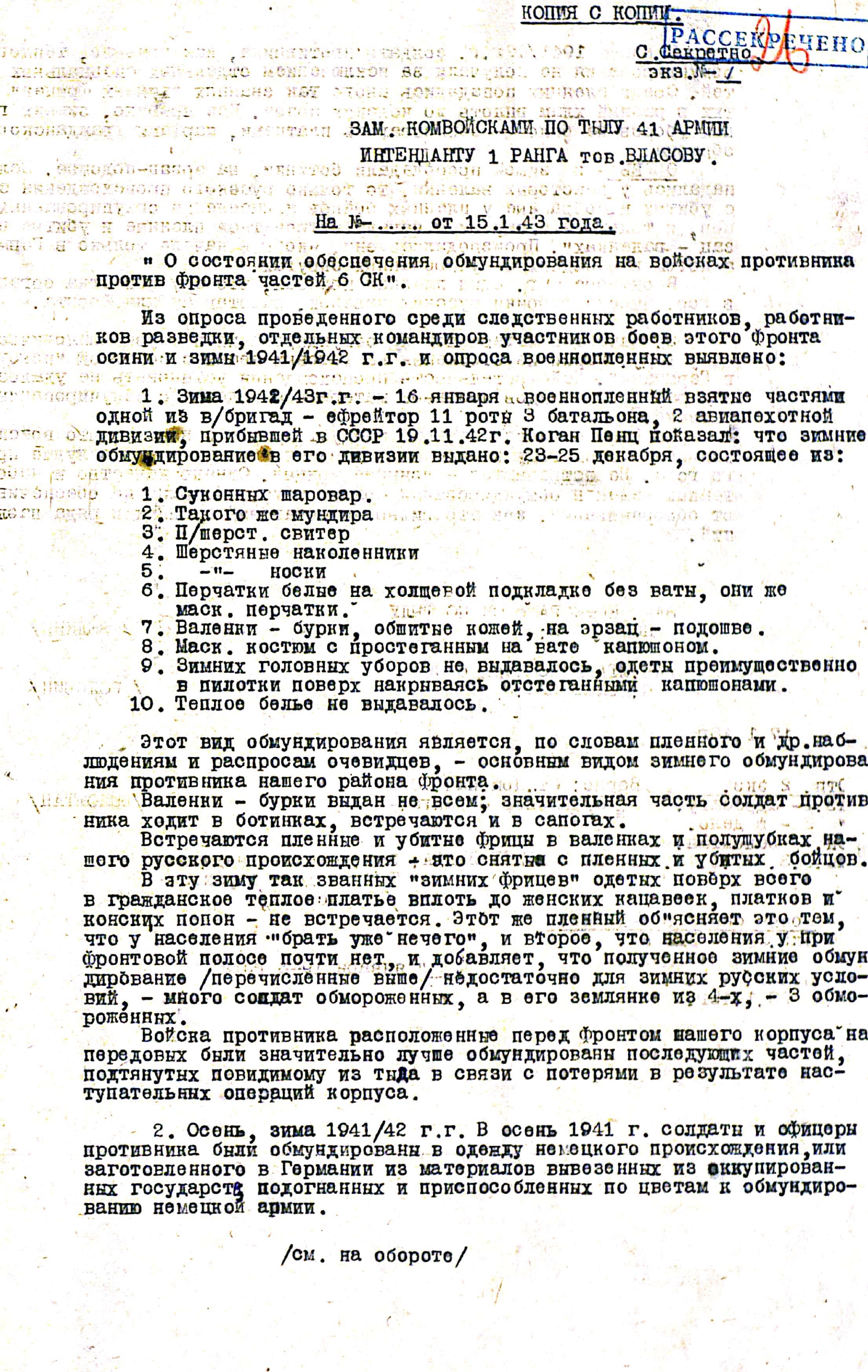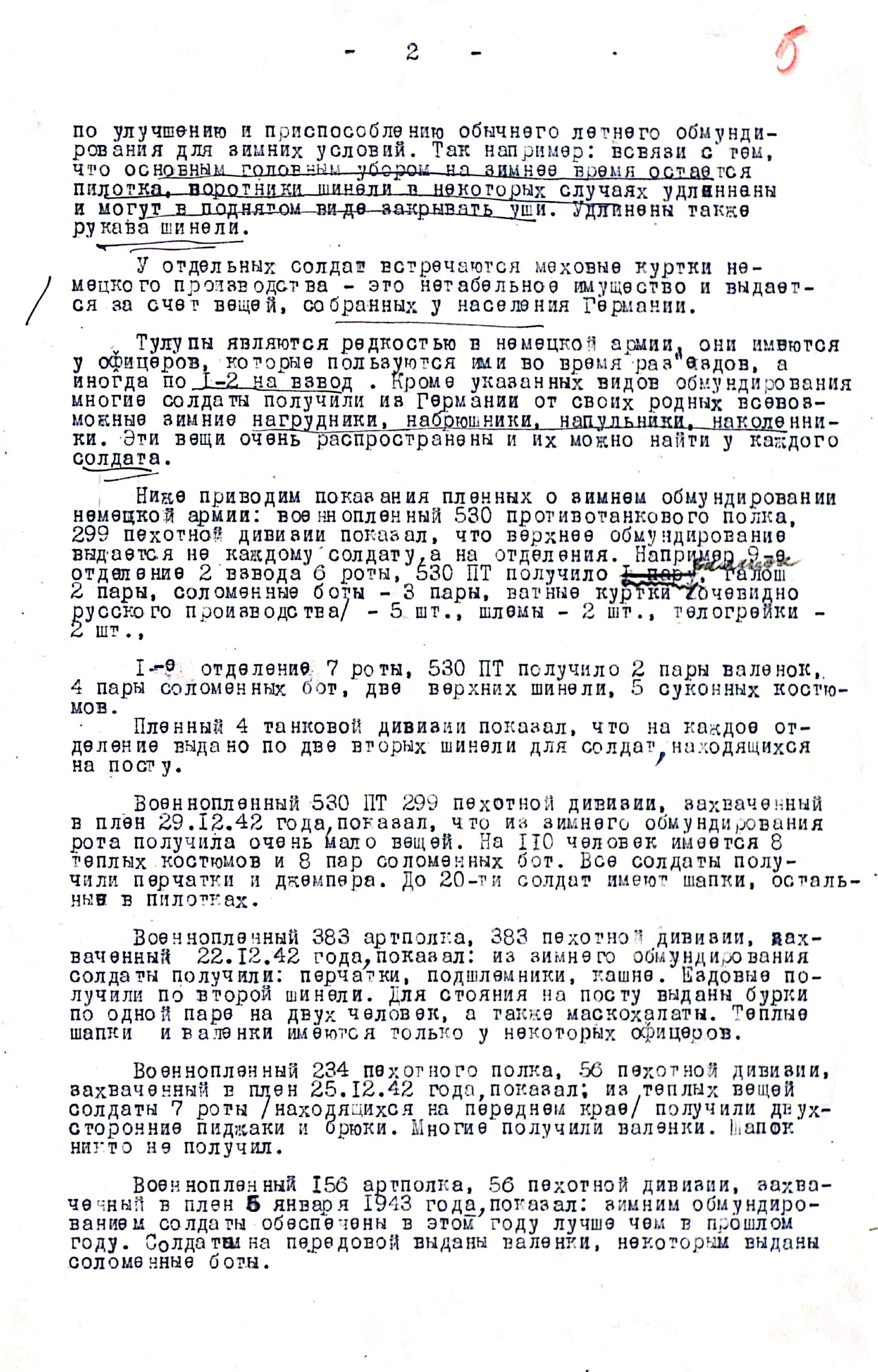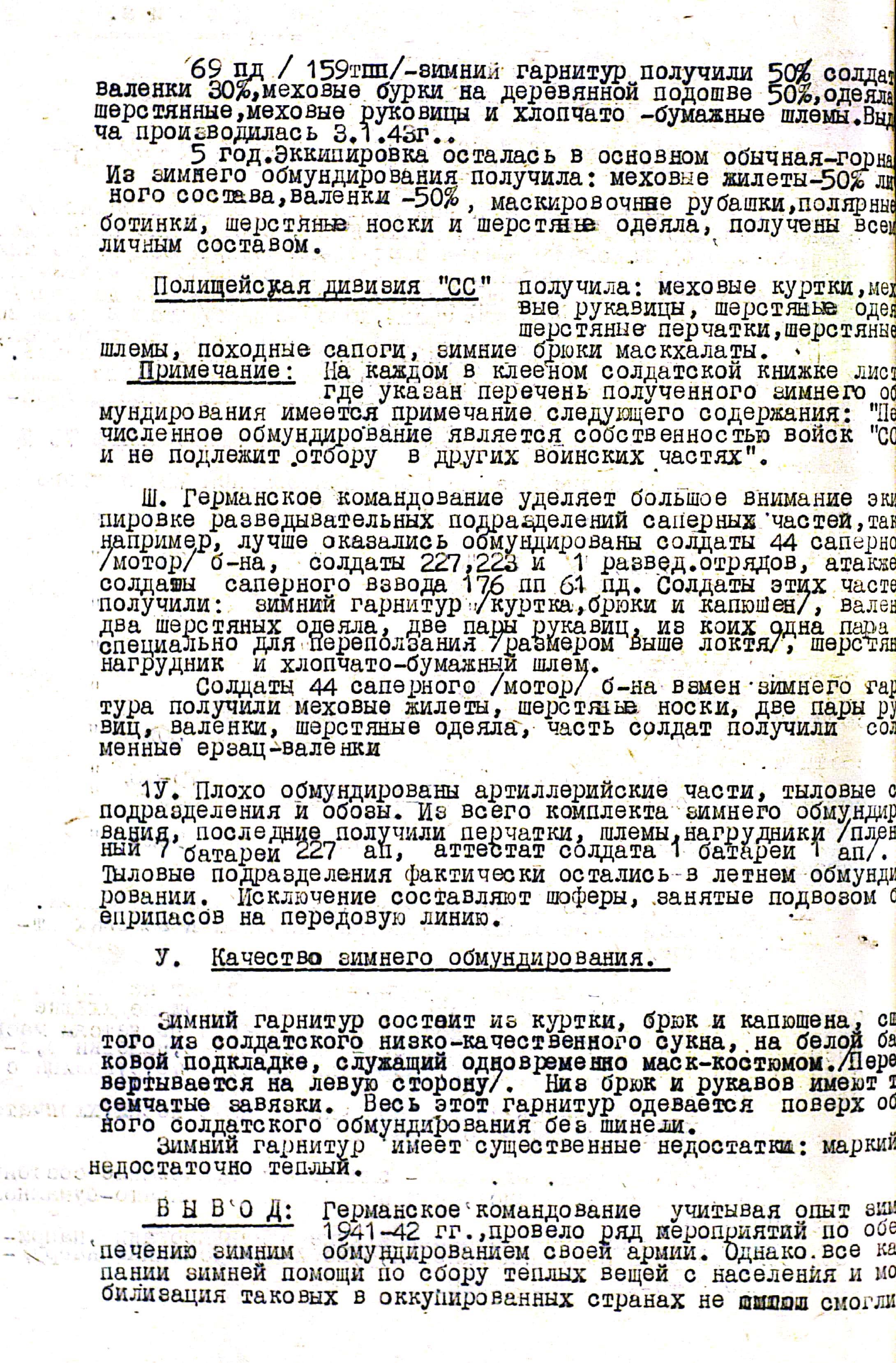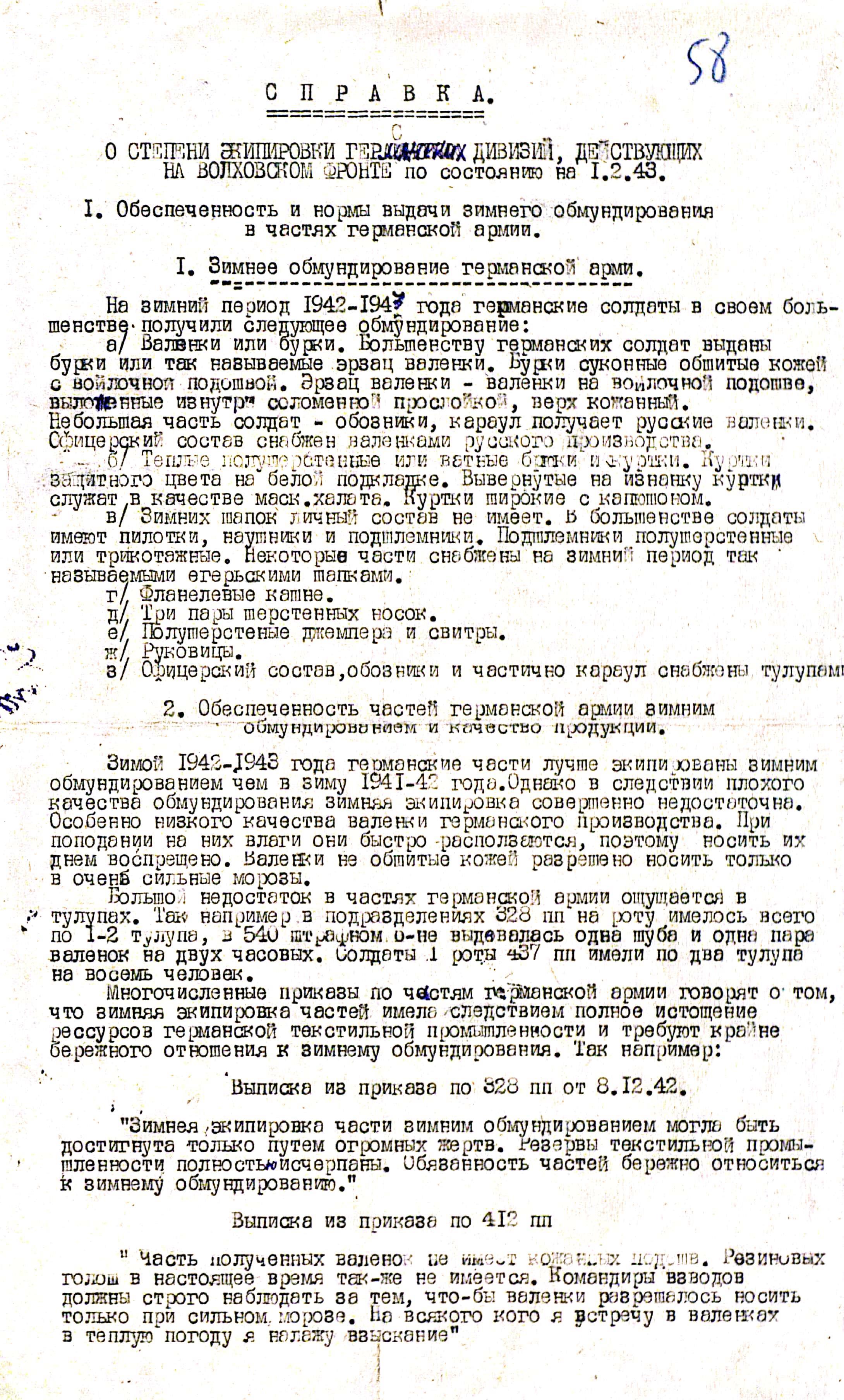 1. В сравнении с зимой 1941 — 1942 г.г. войска противника, действующие против войск Волховского Фронта, теплыми ведами обеспечены немного лучше, но не полностью. Набор теплых вещей и качество их разнообразное; наряду с добротными валенками, отобранными у населения СССР и получаемыми частично (по показаниям пленных) из Минска, распространены меховые бурки на деревянной подошве.