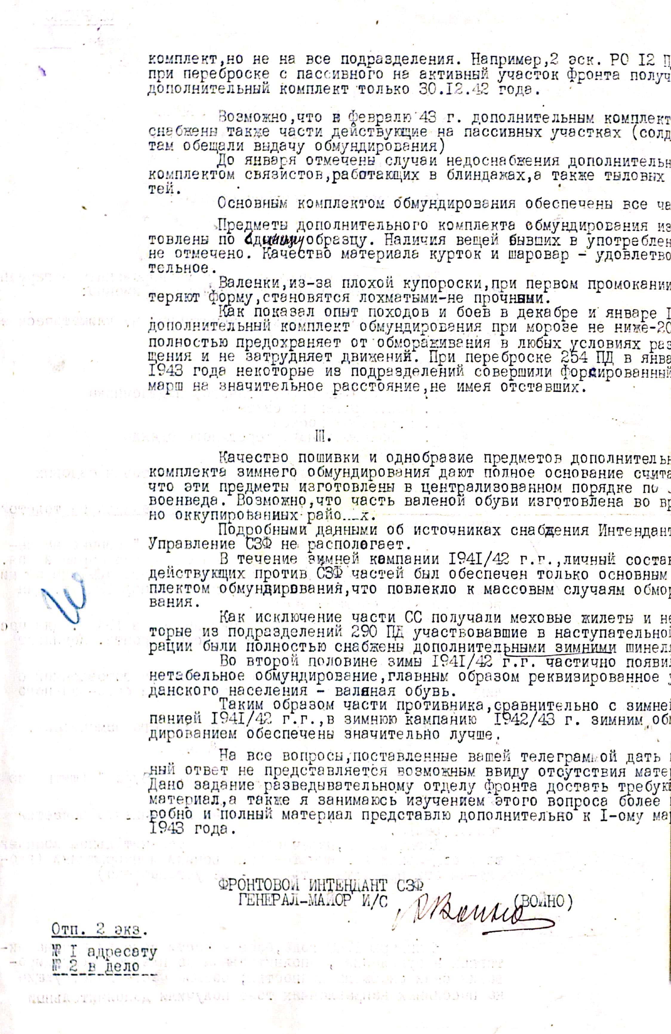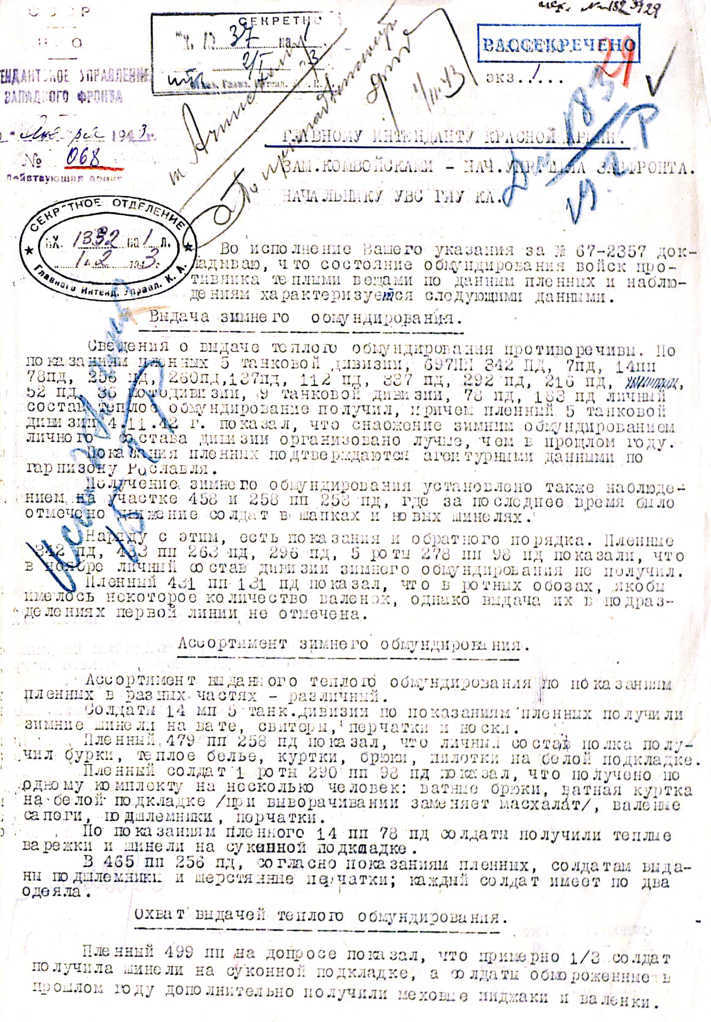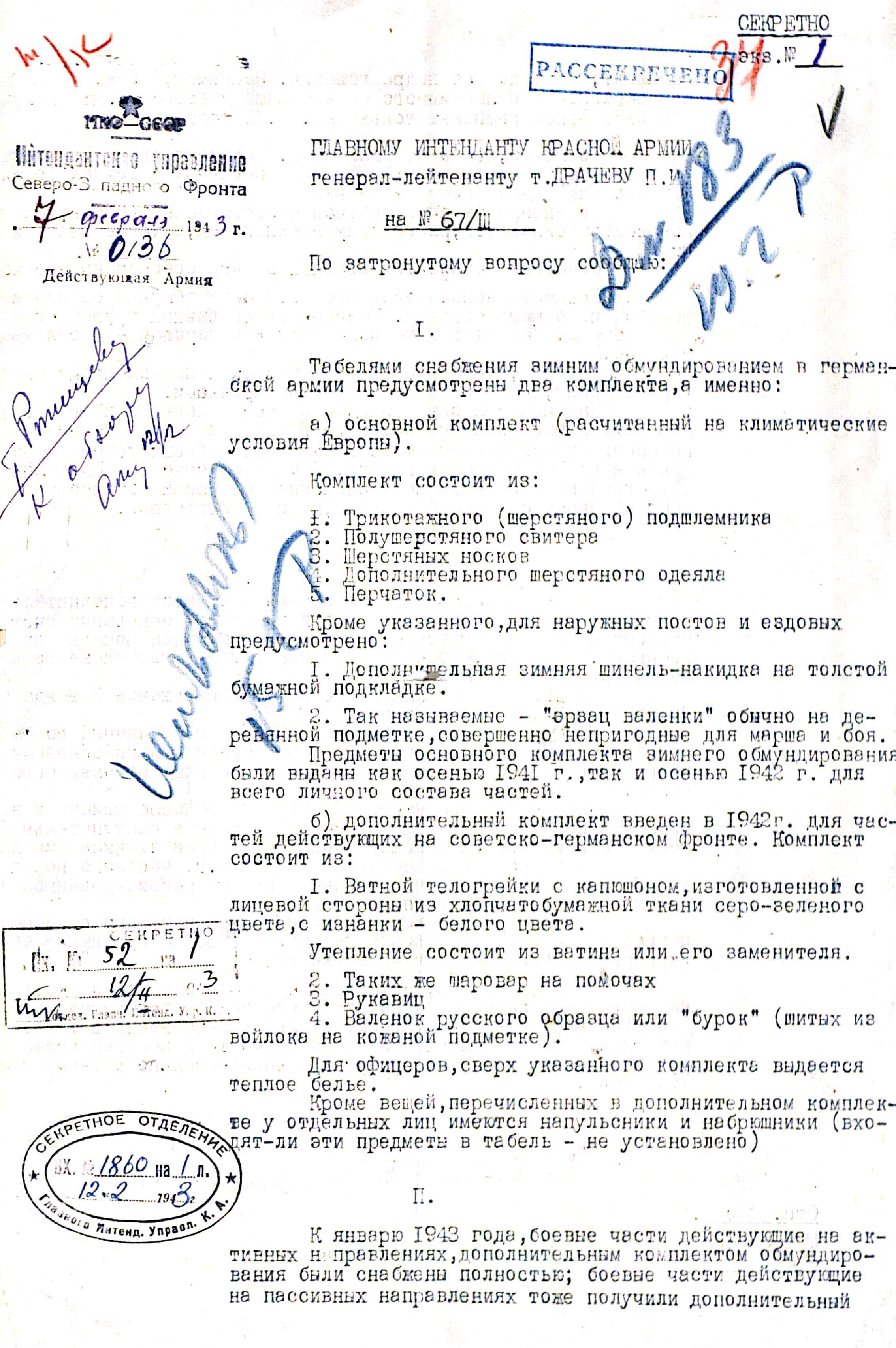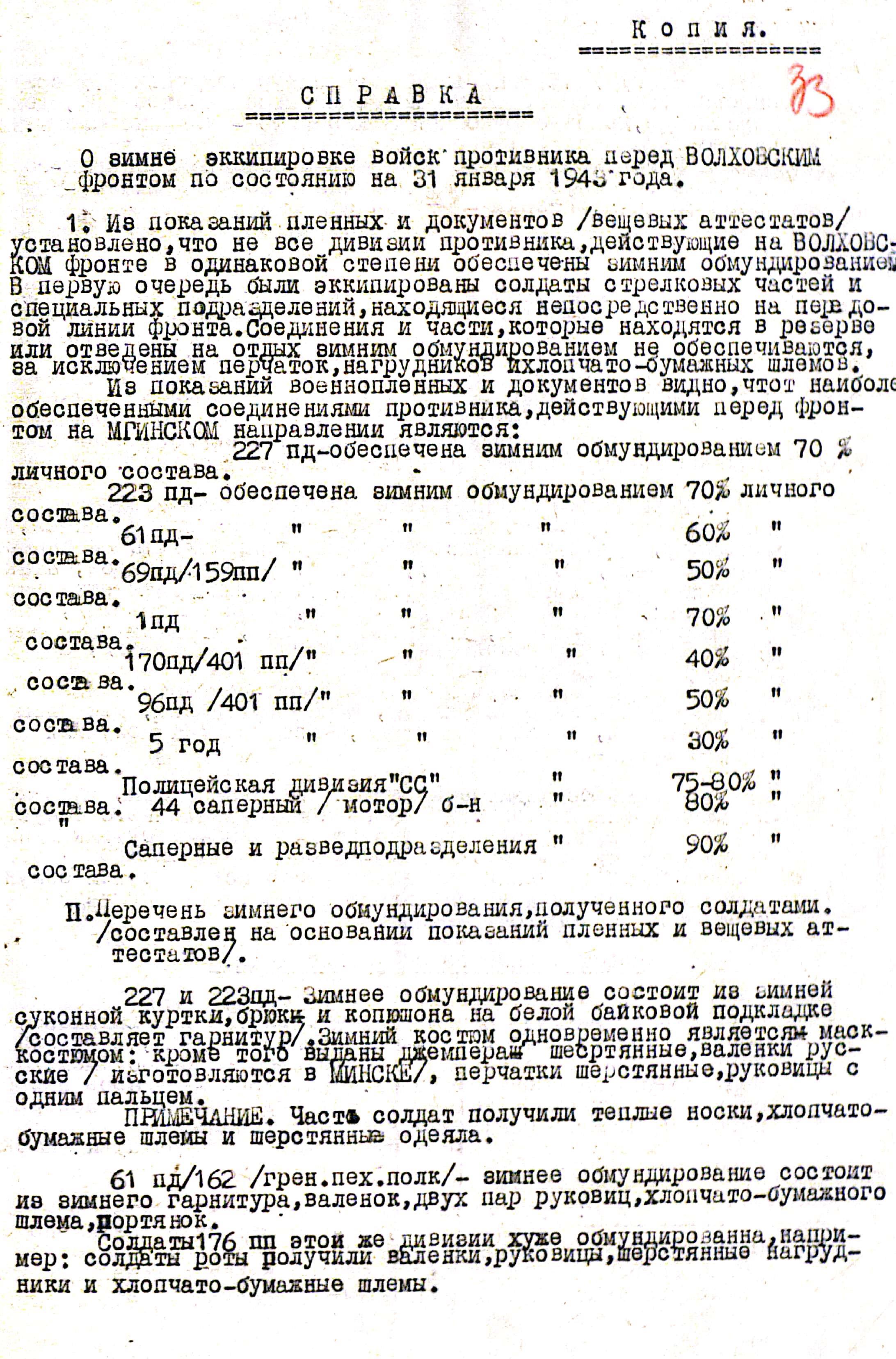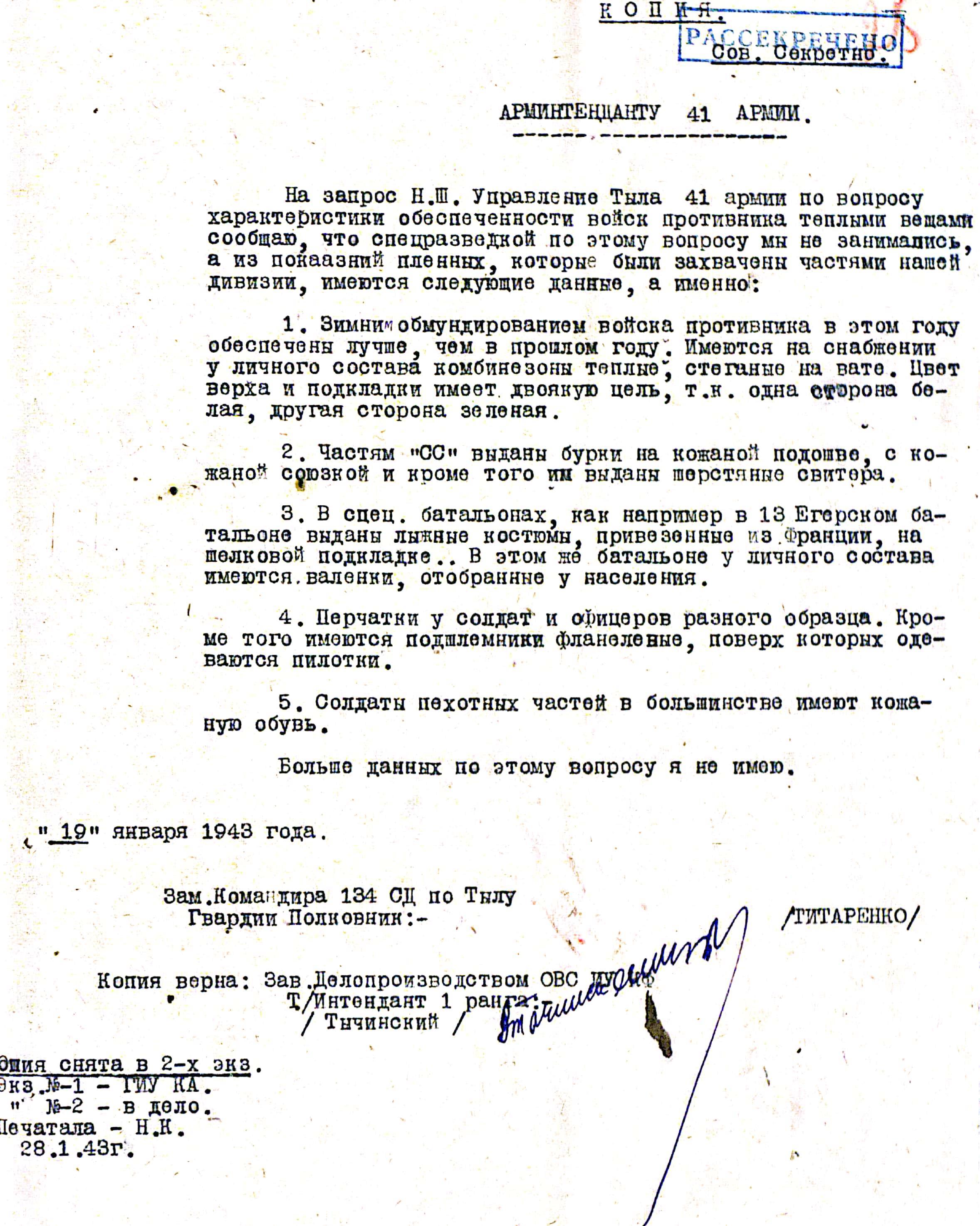 1. В сравнении с зимой 1941 — 1942 г.г. войска противника, действующие против войск Волховского Фронта, теплыми ведами обеспечены немного лучше, но не полностью. Набор теплых вещей и качество их разнообразное; наряду с добротными валенками, отобранными у населения СССР и получаемыми частично (по показаниям пленных) из Минска, распространены меховые бурки на деревянной подошве.