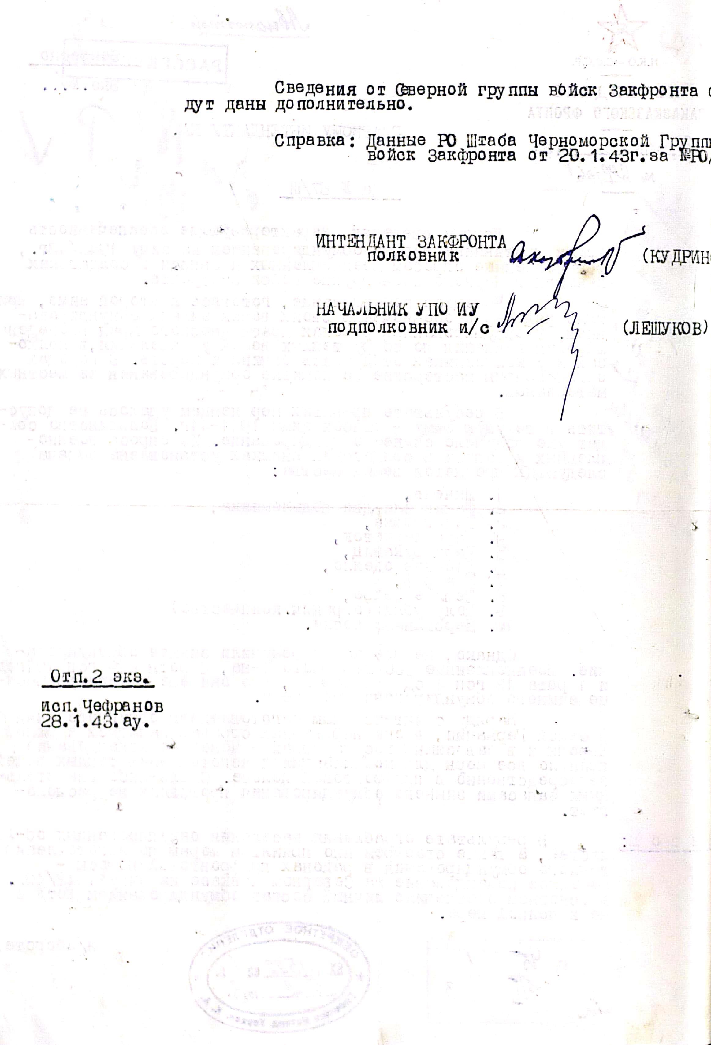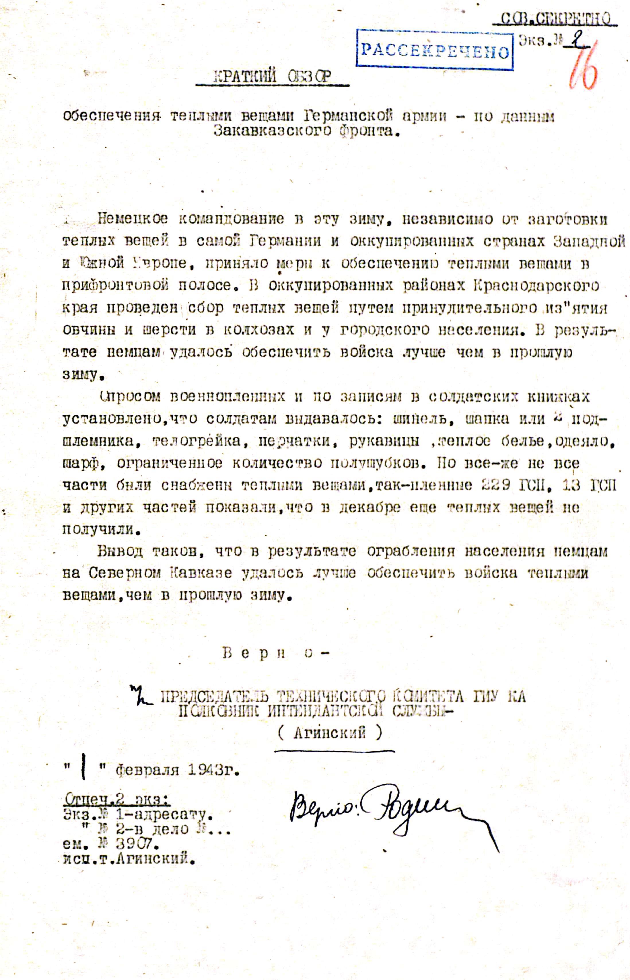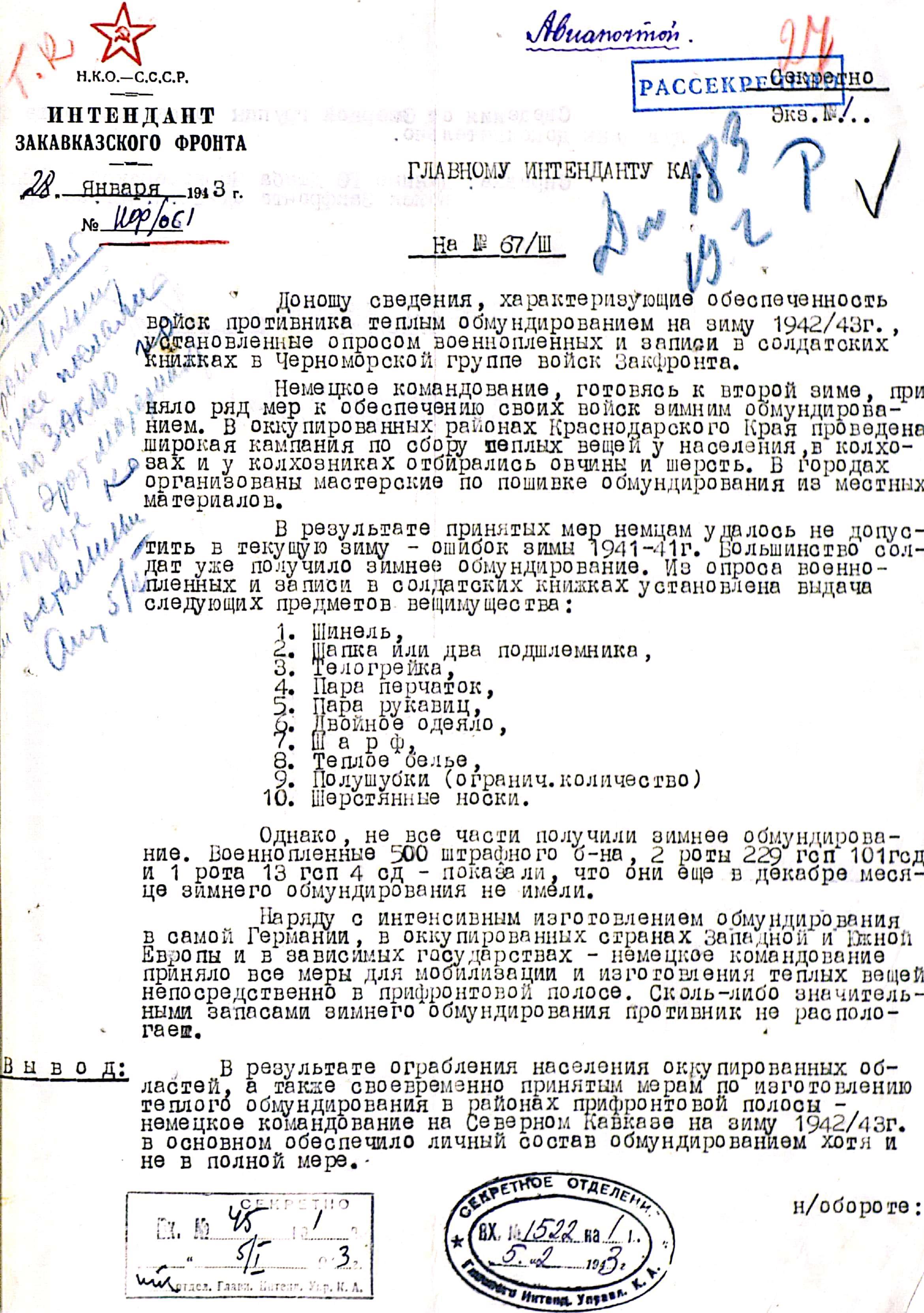 Теплыми вещами войсковые части и подразделения обеспечены хотя и лучше прошлогоднего, но не полностью. Лучшего обеспечения теплыми вещами удалось достичь немецкому командованию за счет отбирания их у населения оккупированных районов (Краснодарский край) и за счет более интенсивного завоза из Германии и оккупированных стран.