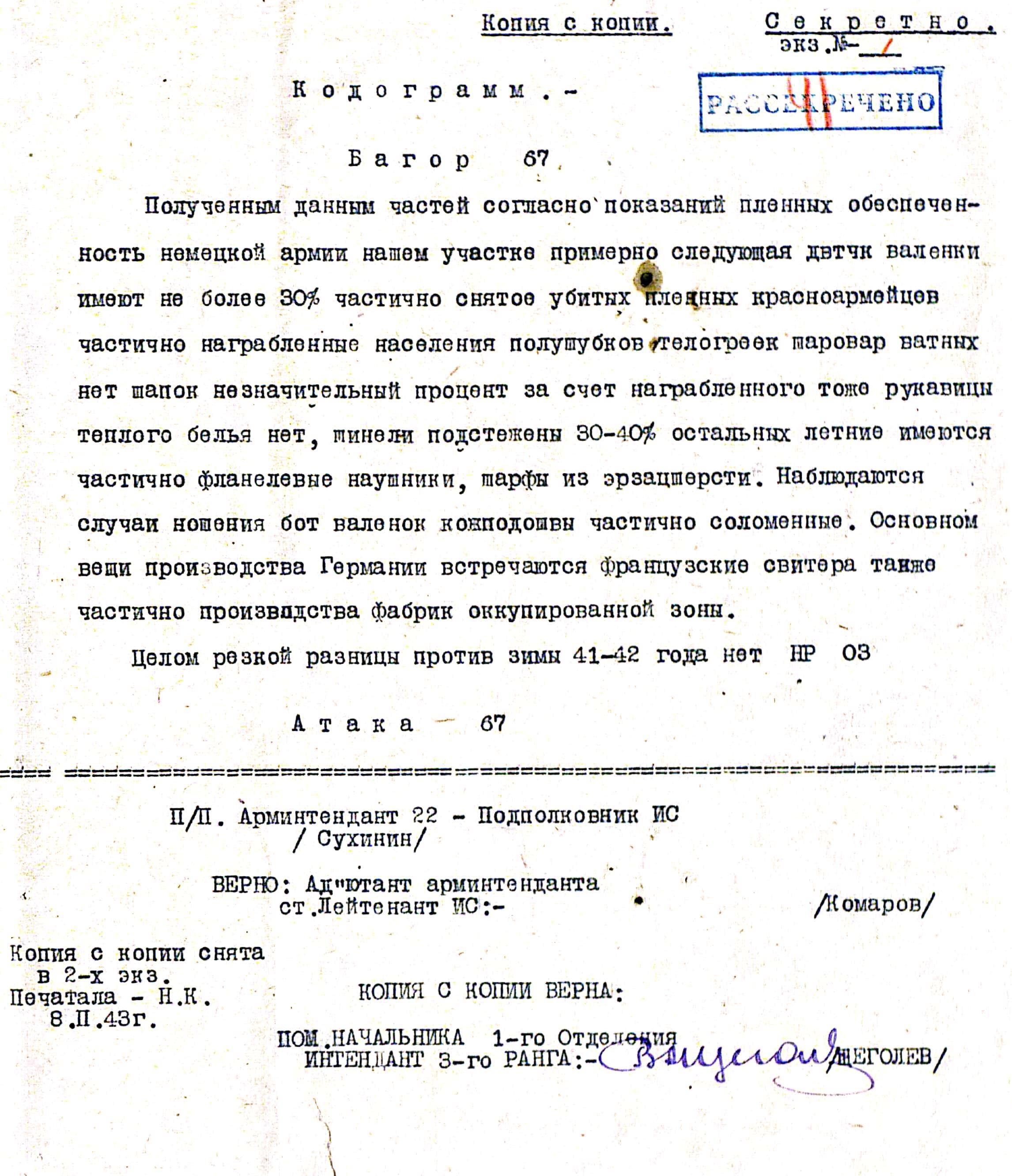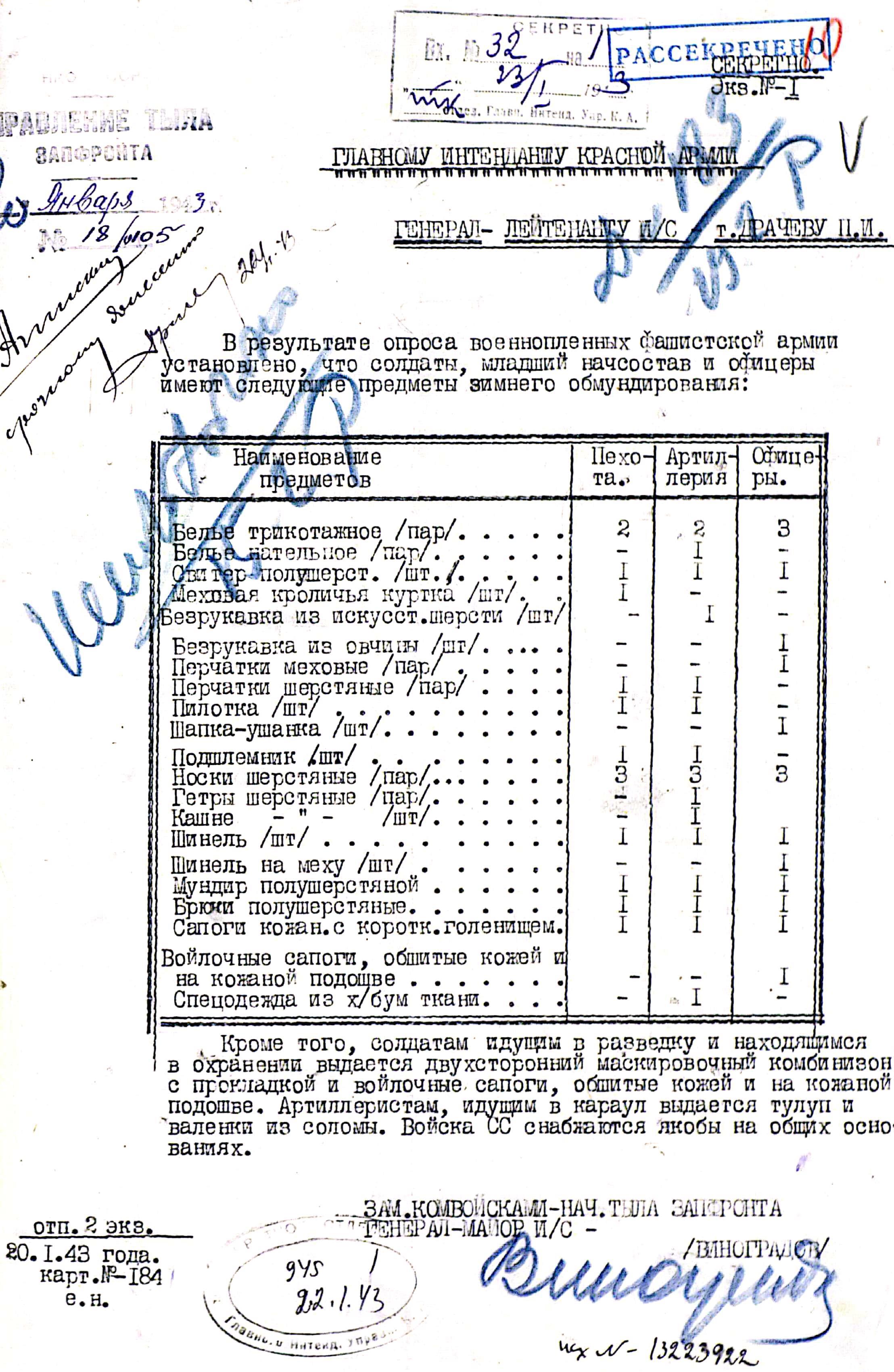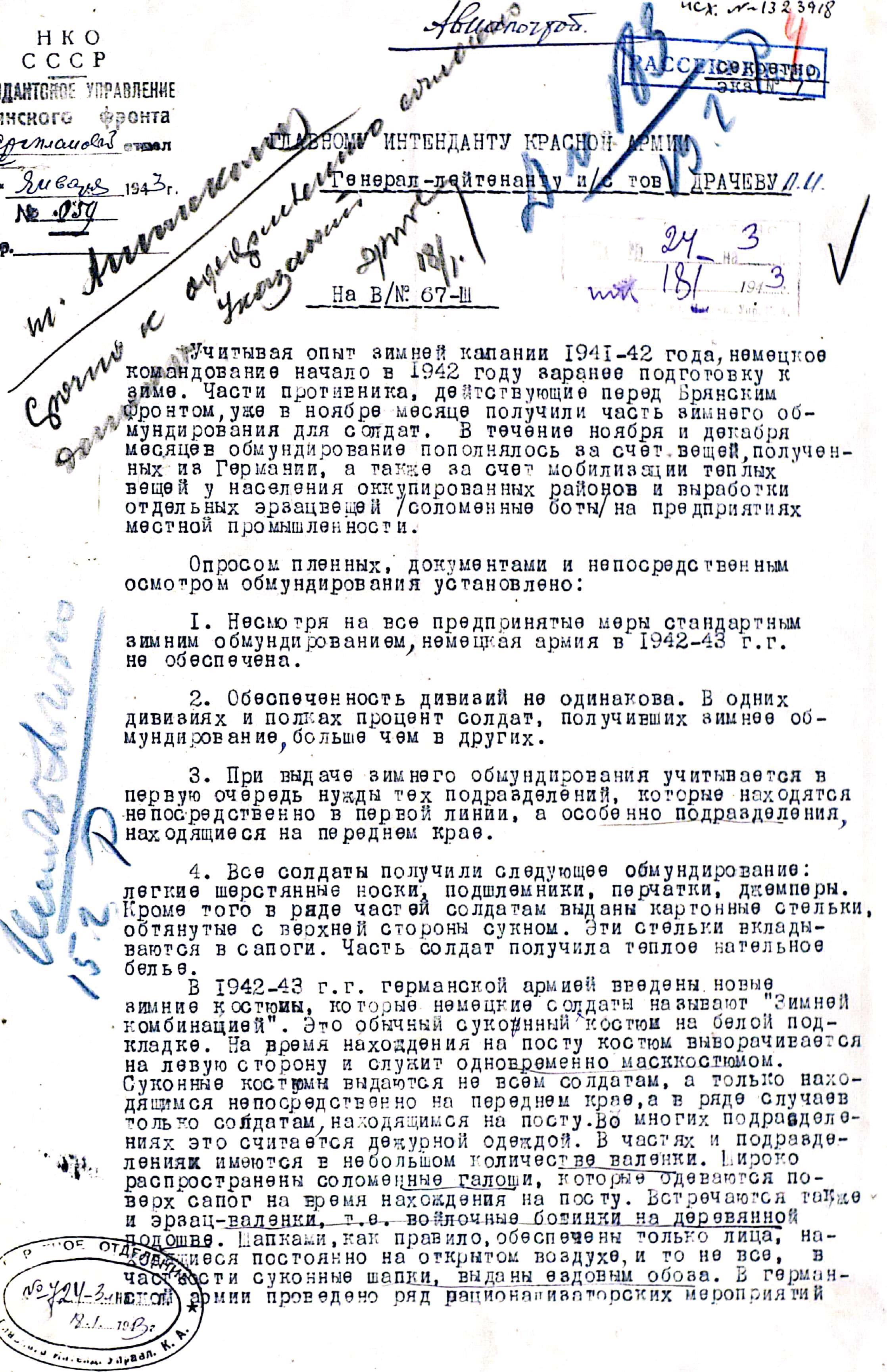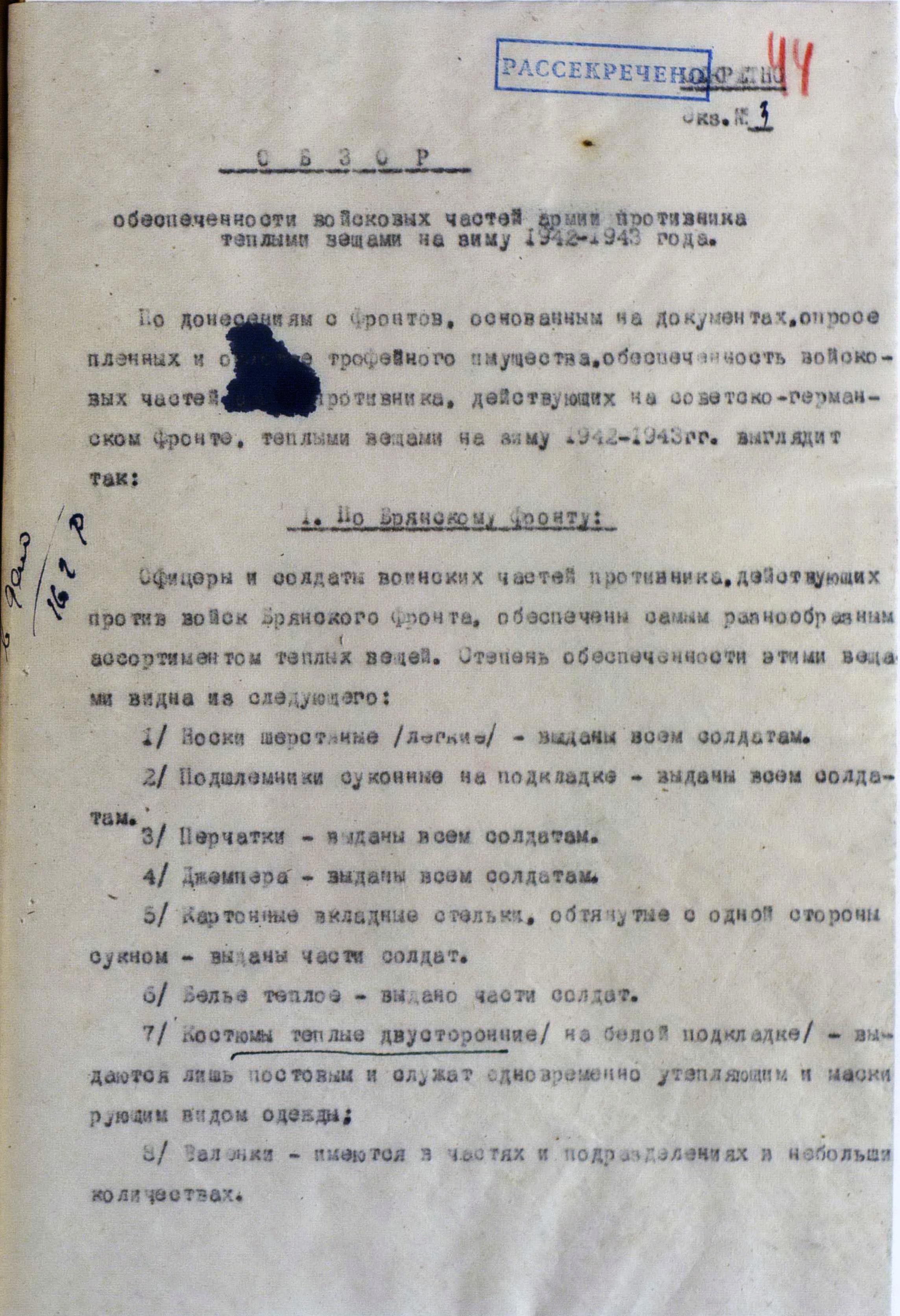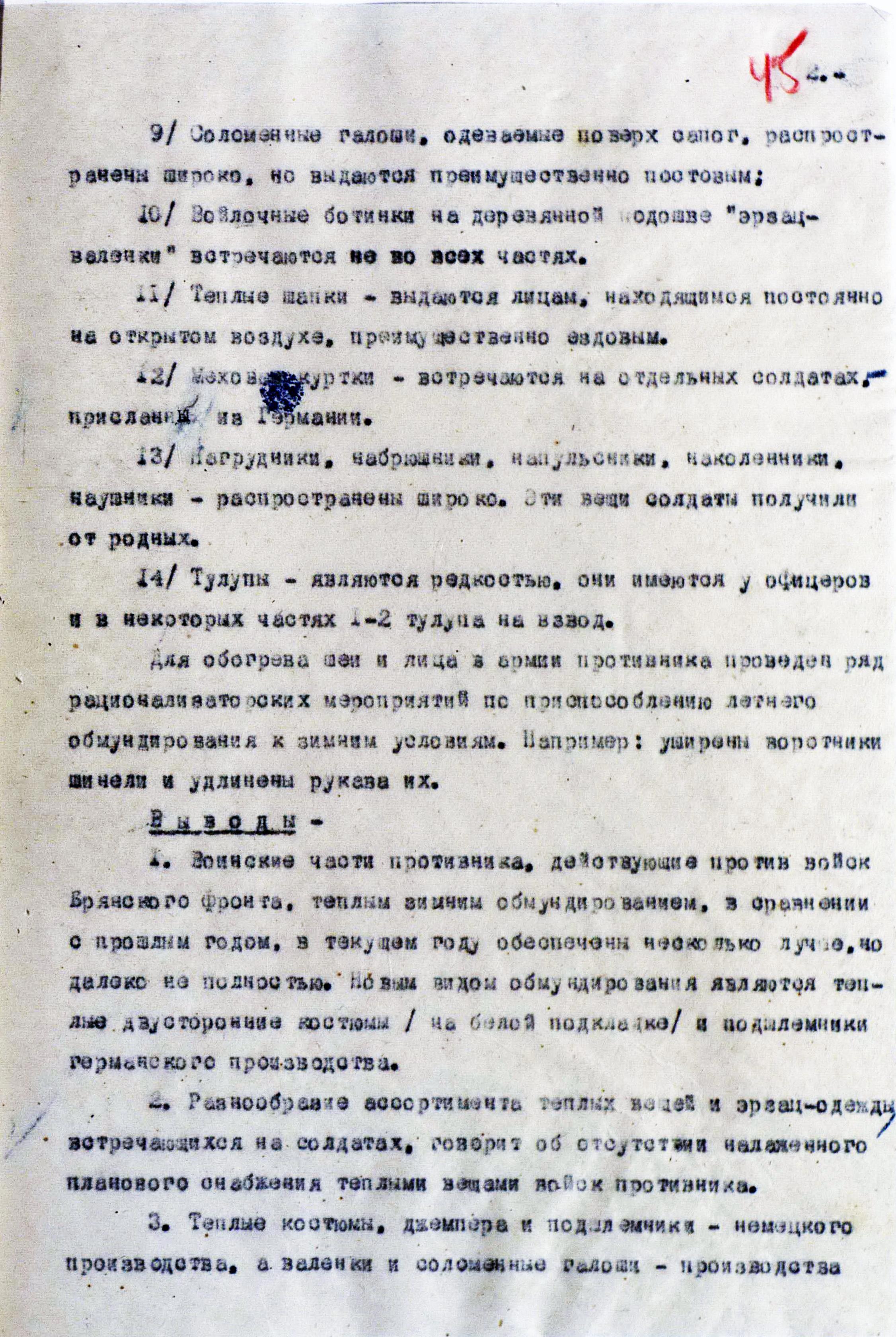 Офицеры и солдаты воинских частей противника, действующих против войск Брянского Фронта, обеспечены самым разнообразным ассортиментом теплых вещей. Степень обеспеченности этими вещами видна из следующего: