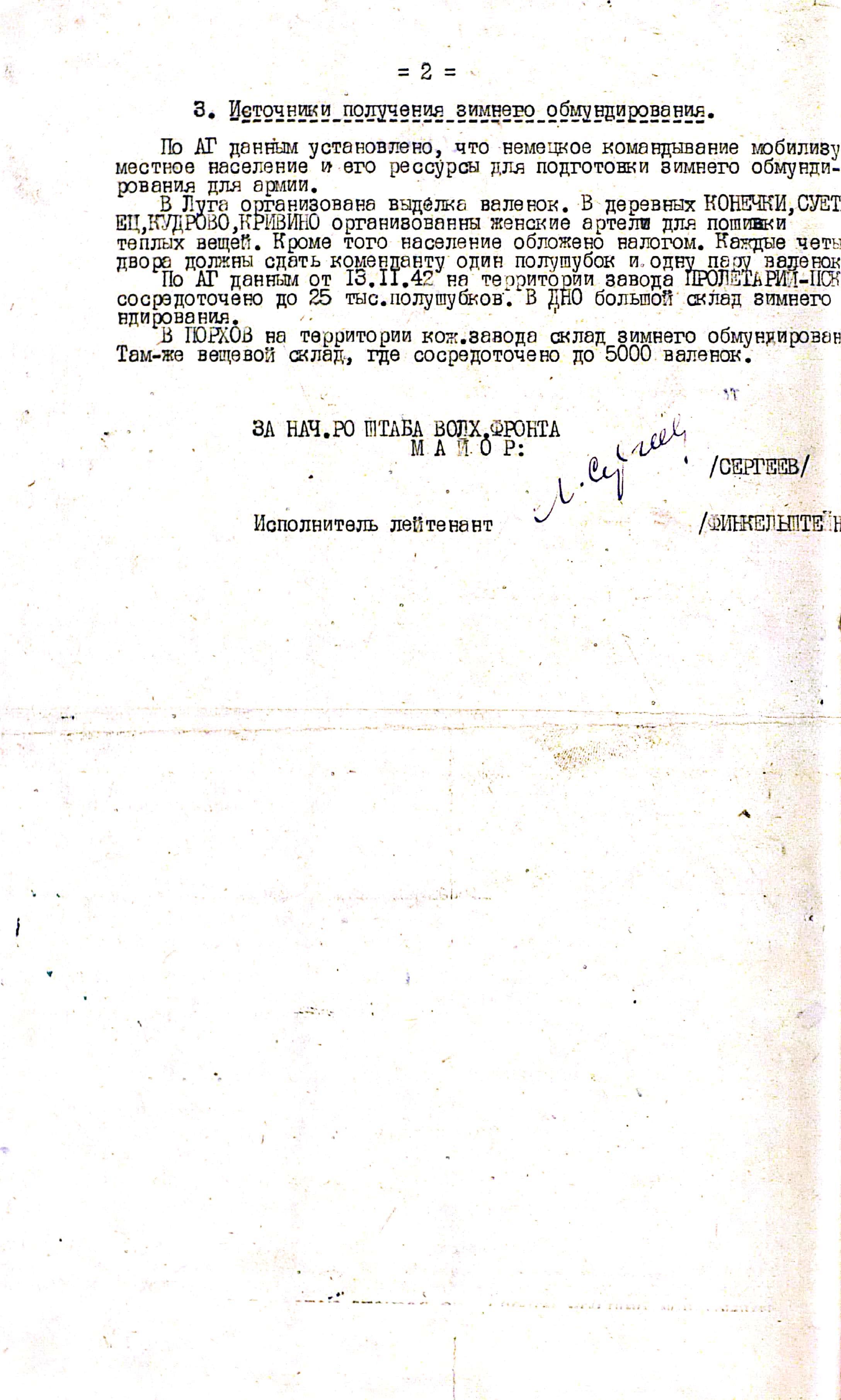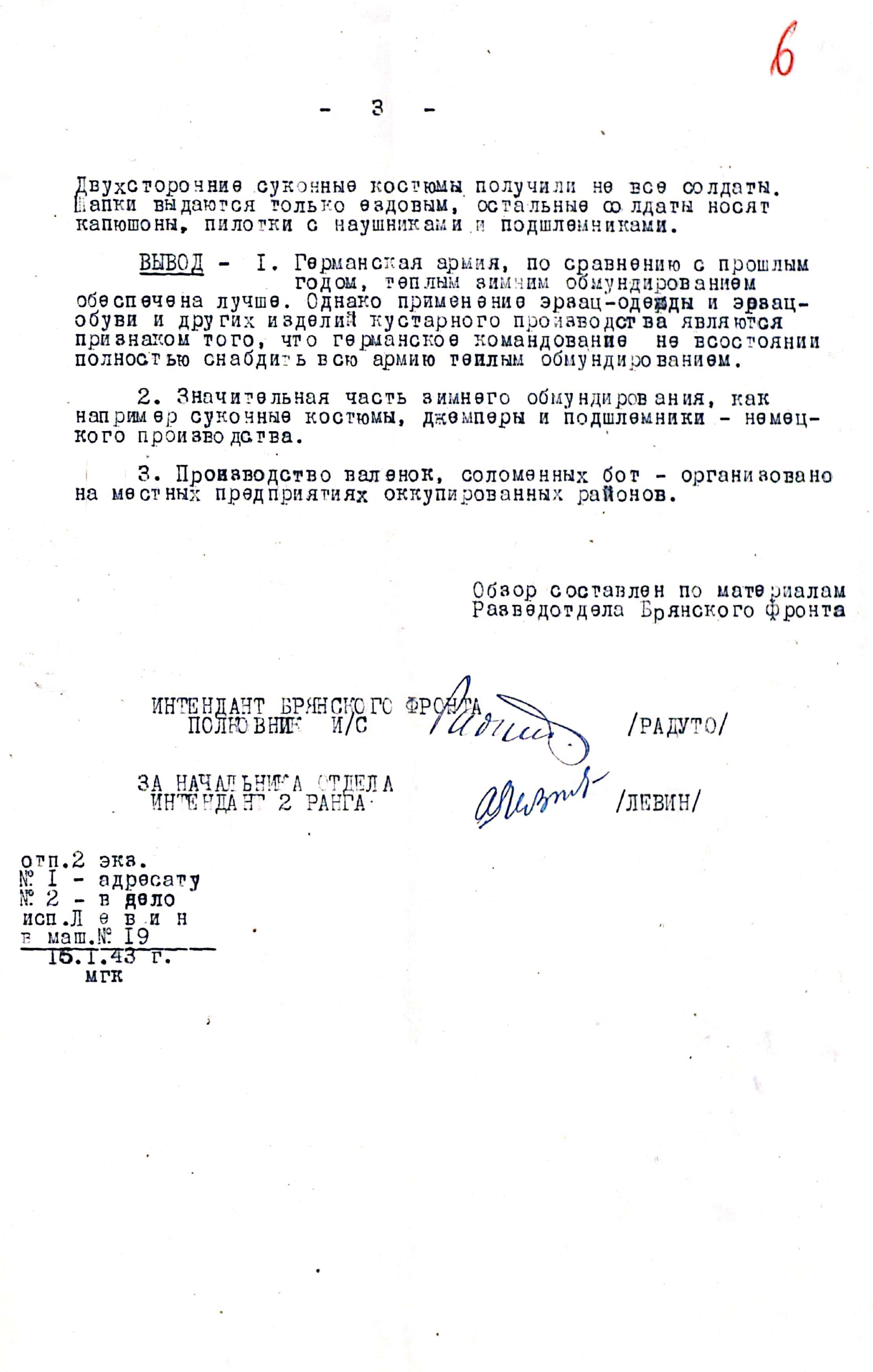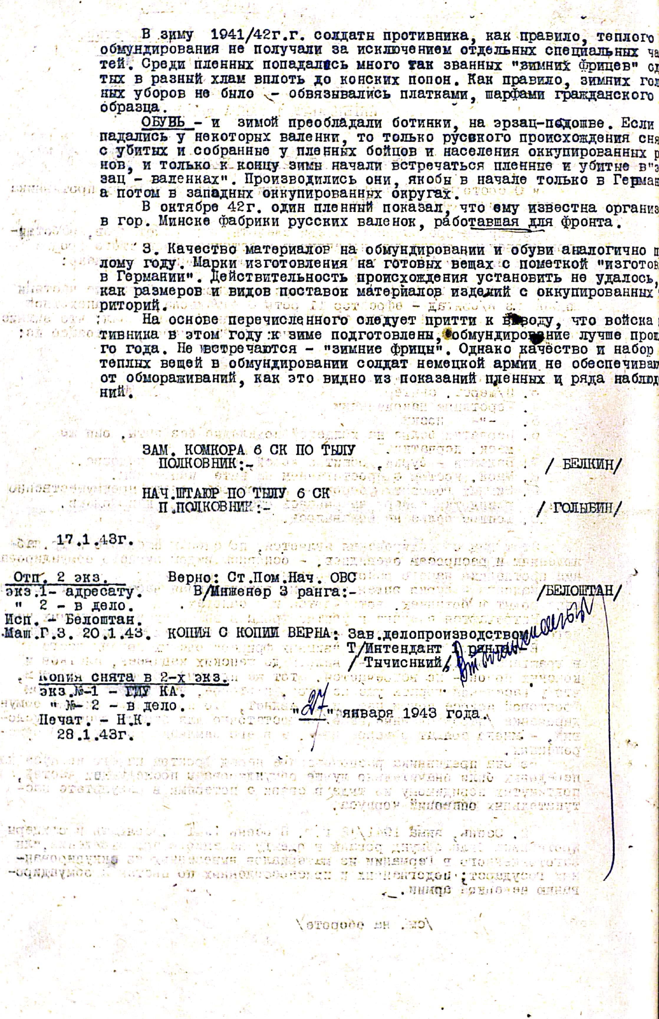 3. Сведения, полученные от разных фронтов, подтверждают организацию противником в г. Минске производства валенок. Обеспеченность войск противника теплой обовью не высокая; значительная часть войск обеспечена кожаной обувью, теплыми носками и вкладными стельками.