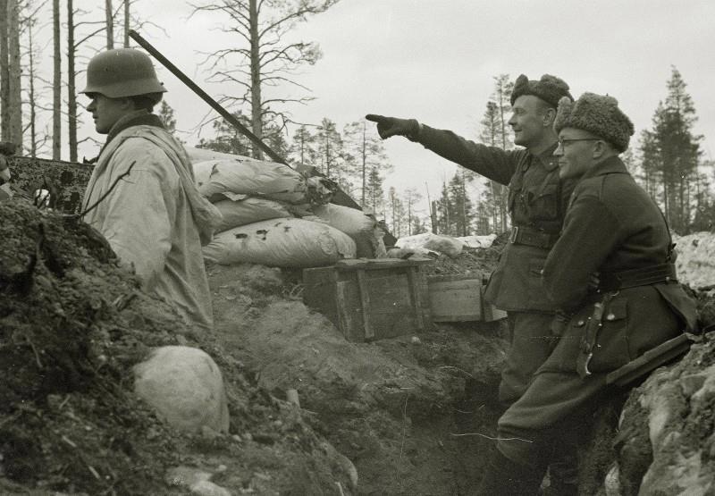 Финские офицеры в окопе у пулеметчика. Через несколько мгновений, советский снайпер вычеркнет из списка живых некультурного штабного офицера, показывающего куда-то пальцем.