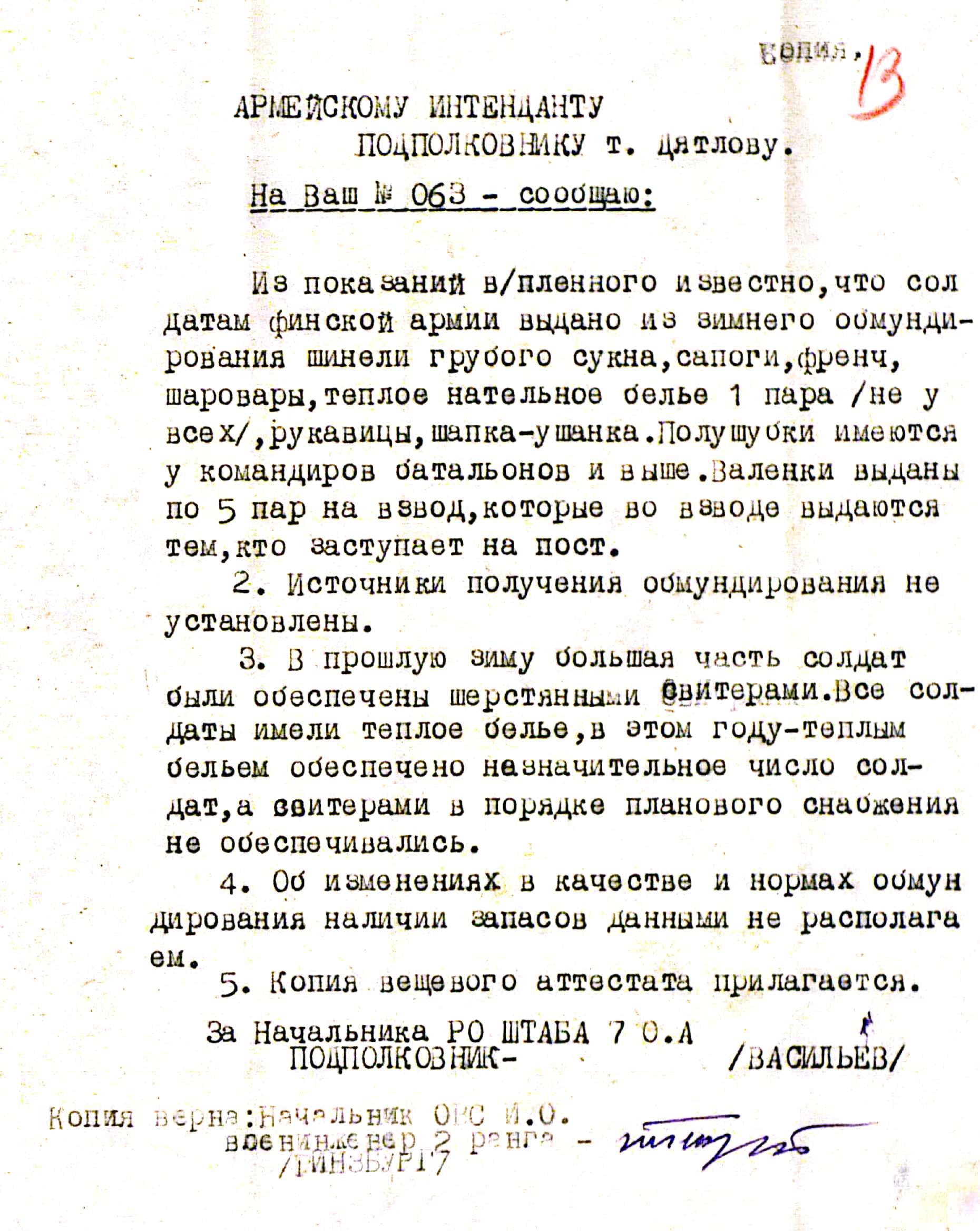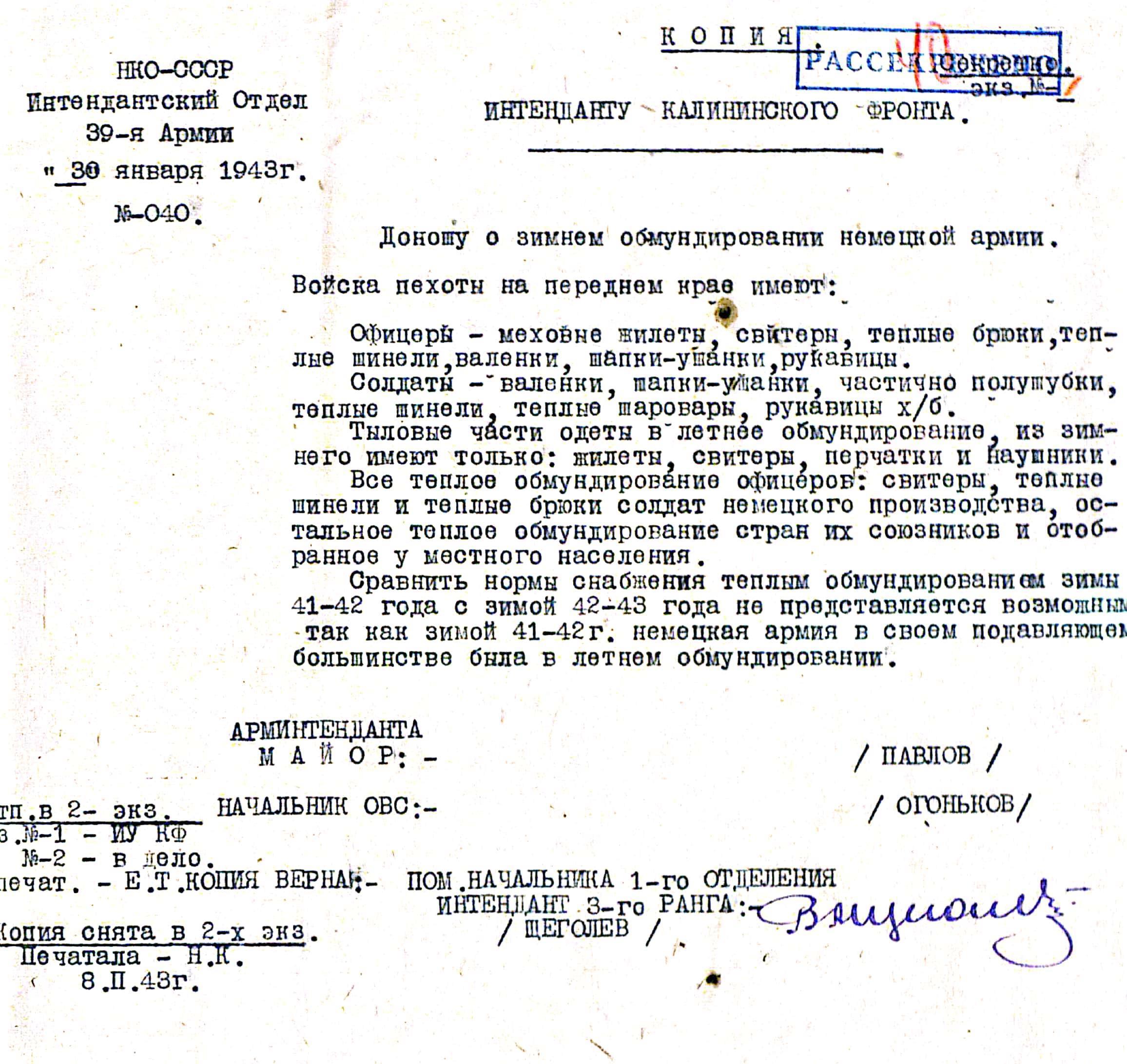 1. Войска противника, действующие против войск Калининского фронта, теплыми вещами в текущем году обеспечены лучше.