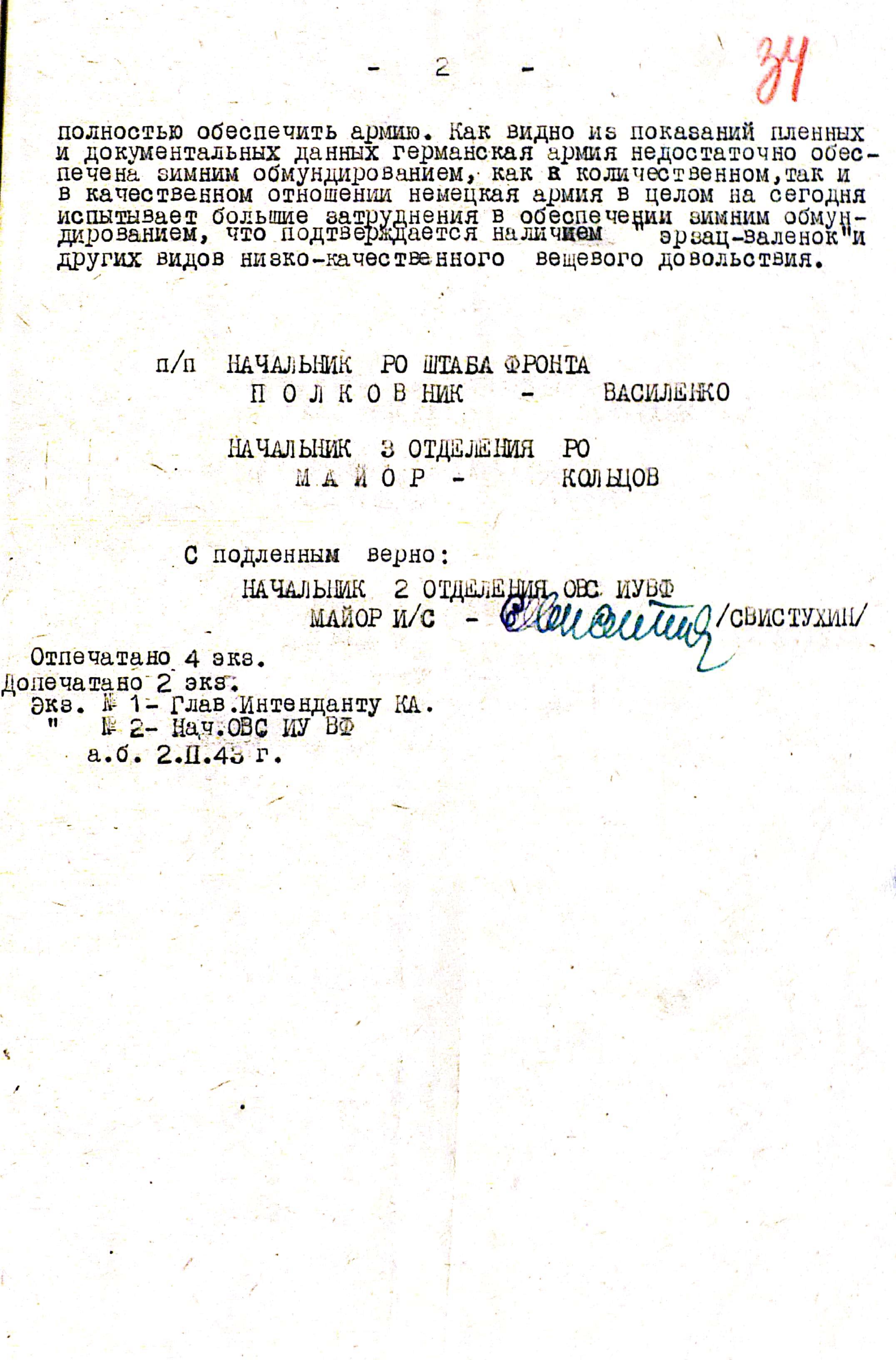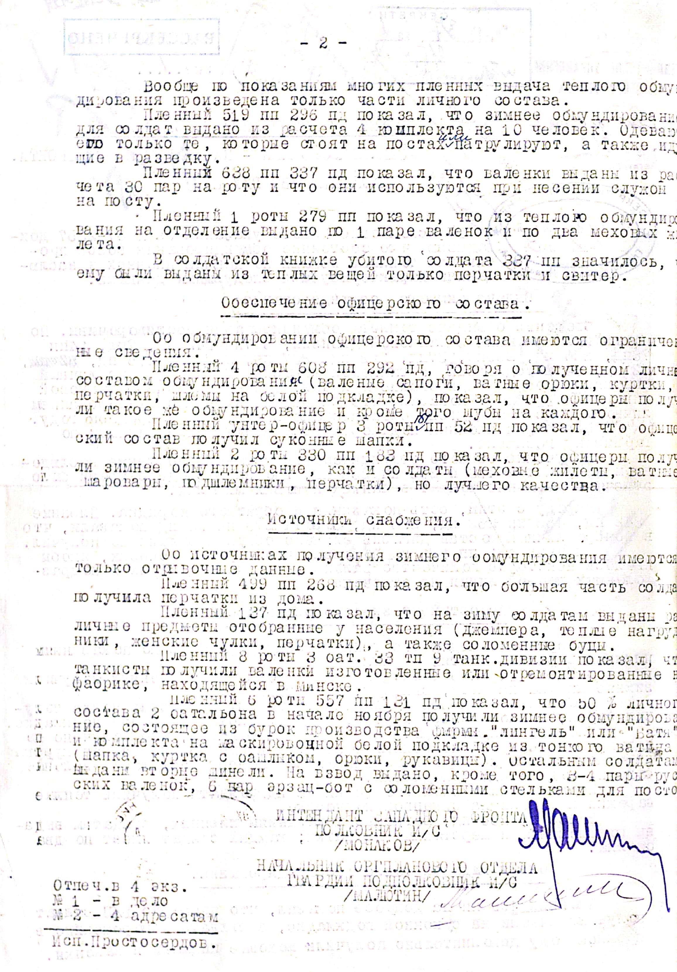 2. Полностью войска противника теплыми вещами не обеспечены: стрелковые дивизии и специальные подразделения, находящиеся на передней линии фронта, обеспечены от 30 до 90%, артиллерийские части, тыловые подразделения и обоз теплых вещей почти не получили.