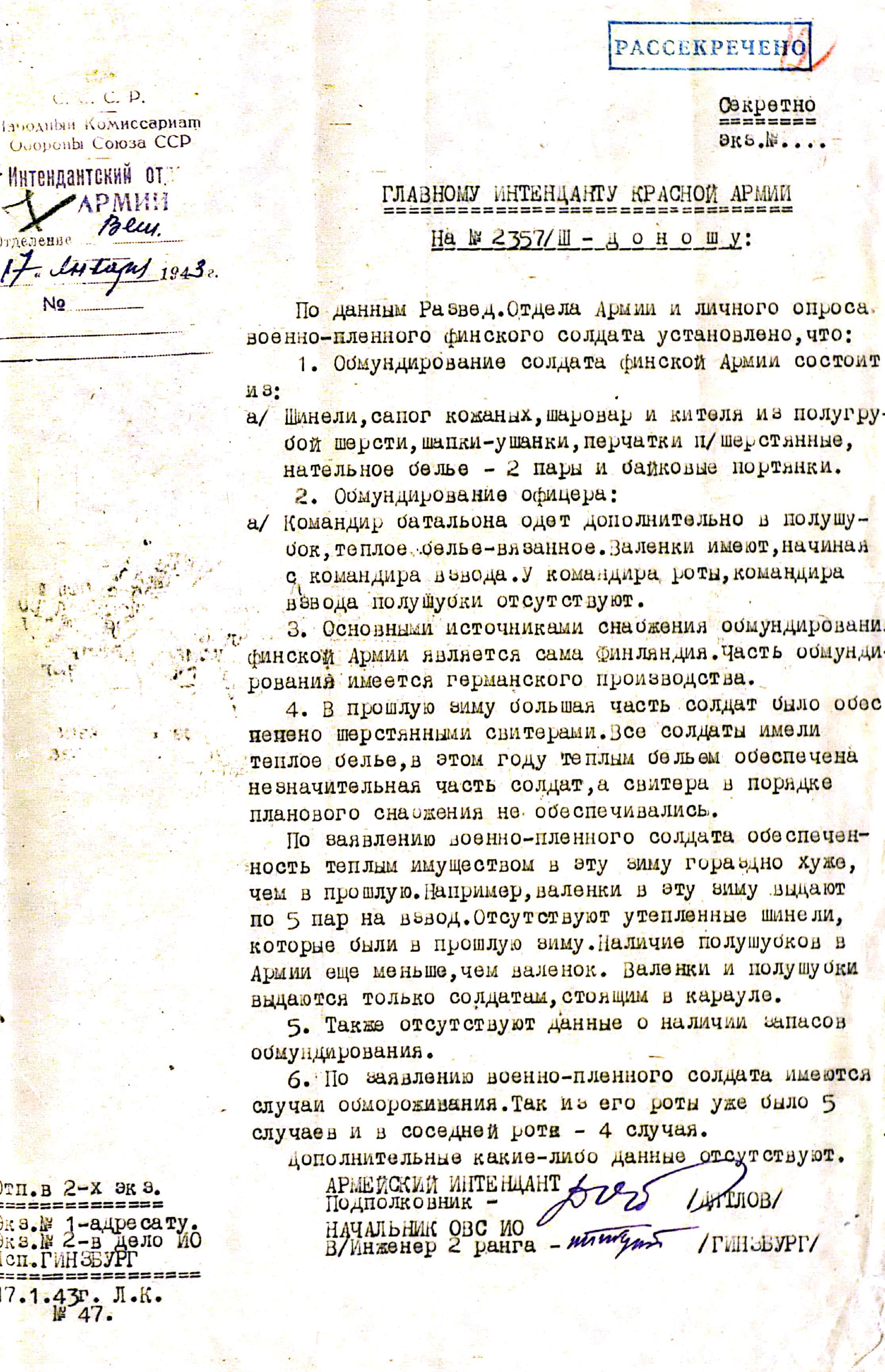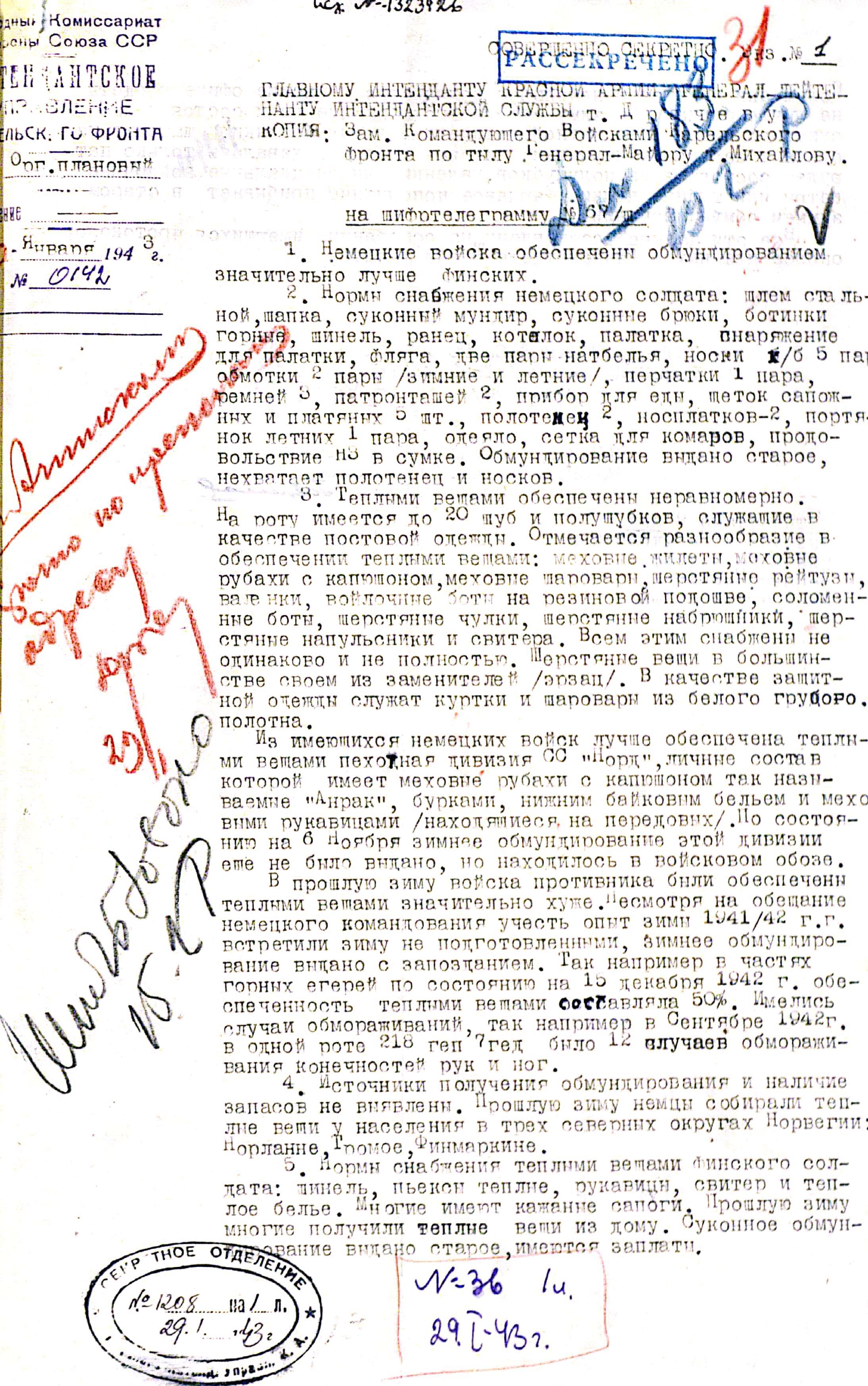 Возможно кому-то покажется странным, но работа разведки не ограничивается изучением того, какие воинские части стоят против наших войск, чем они вооружены и каково их морально-психологическое состояние. Не менее важно знать то, как обеспечен противник, по каким нормам и чем питается, как снабжается тёплыми вещами, какие у него изменения в материальном обеспечении. И если на уровне полка - дивизии все эти сведения кажутся не слишком существенными, то анализ множества разведывательных донесений, документов опроса и допроса пленных, позволяет сделать более серьёзные выводы.