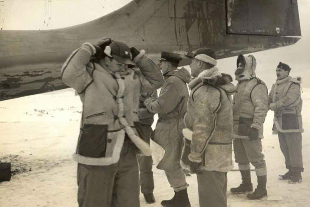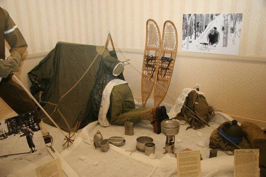 Использование фанеры, скрепленной смолой, сокращает вес снегоступов вдвое и делает их прочнее. Лыжи, которые складываются посередине на стальных петлях без ржавчины, легче переносить, а новый комбинезон coldweather flyer открывается с обеих сторон от носка до плеча, чтобы пилот мог застегнуть или снять его, не вставая.