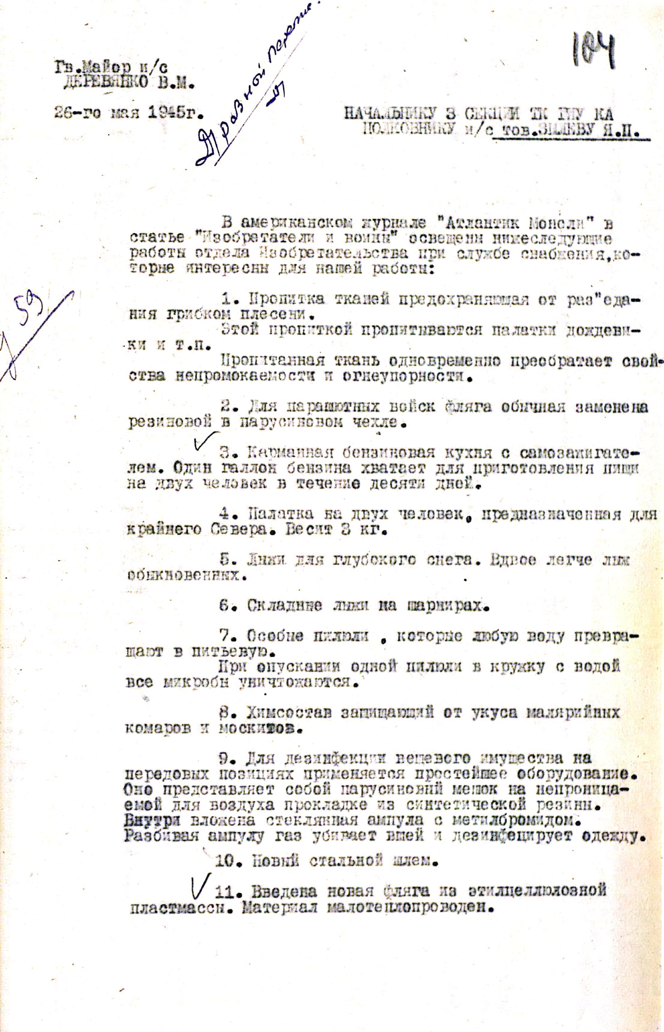 В мае 1945 г., в Техком ГИнтУ попал июльский, 1943 года, номер американского журнала The Atlantic Monthly со статьёй, рассказывающей о новинках, разработанных в США и о работе интендантов американской армии. Неизвестно, как журнал оказался в Москве, ГИнтУ его не выписывал, скорее всего подарил американский интендант или "замполит".