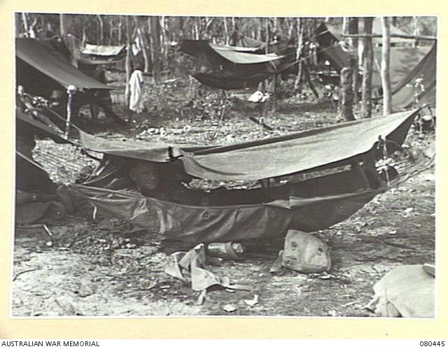 Спальные принадлежности - особая проблема в джунглях из-за наземных насекомых и влаги, малярийных комаров и дождя. Это была еще одна работа для Интендантского корпуса. Его тропические эксперты, работая с производителями, разработали гамак для джунглей, одно из самых удобных приспособлений, появившихся после войны. Под гамаком, который сделан из тонкой прочной ткани, висит фальшивое дно. Это образует изолирующее пространство, которое обеспечивает дополнительную защиту в прохладные ночи и предотвращает нападение насекомых на спящего через тонкий гамак. На его нижней стороне есть петли, куда солдат может повесить свою винтовку, пайки и так далее, защищенные от сырости и паразитов. Над гамаком находится двускатная крыша из легкой ткани, водонепроницаемой синтетической смолой; и прочно пришитая как к гамаку, так и к крыше москитная сетка, которая открывается с одной стороны с помощью молнии. Этот гамак целиком состоит из одного куска, сворачивается в небольшой сверток и весит всего шесть фунтов.