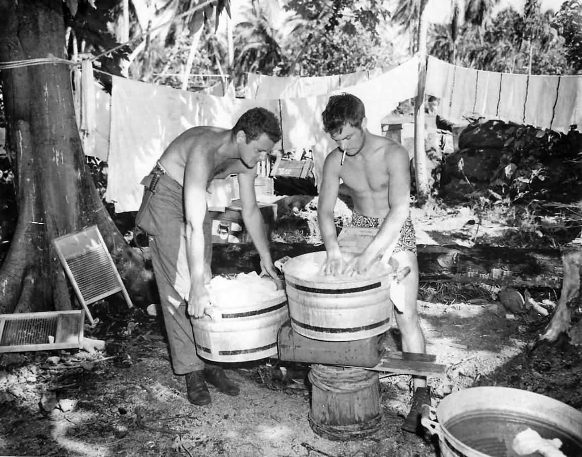 ЧТОБЫ ЗАЩИТИТЬ солдат в тропиках от грязи, солнечных ожогов, микробов и насекомых, Корпус квартирмейстеров разработал множество новых устройств и химических соединений. Появилось новое универсальное мыло, которое легко пенится в мягкой, жесткой или соленой воде, имеет сладковатый вкус, что делает его приемлемым в качестве средства для чистки зубов, и может использоваться для бритья или для стирки рубашки. Существует «гигиеническая помада», разработанная как губная помада, и специальный крем для лица, оба из которых отфильтровывают короткие ультрафиолетовые лучи солнца, которые обжигают, но пропускают длинные лучи, которые загорают. Существуют химические гранулы, чтобы сделать воду пригодной для питья. Солдат бросает одну таблетку в свою флягу, чтобы убить микробы, затем бросает другую таблетку, которая устраняет химический привкус. Когда вода очищается оптом, трудно сказать, сколько гранул требуется, поэтому была разработана тестовая колба с желто-зеленой полосой, которой должна соответствовать очищенная вода.