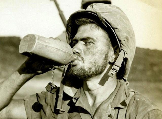 Мы вступили в войну с алюминиевой столовой, принятой на вооружение в 1910 году, но сейчас белый металл нужен для самолетов. Была принята легкая фляга из этилцеллюлозного пластика. Новая фляга настолько прочная, что на ней можно прыгать; она не издает металлического лязга, выдающего положение человека, а поскольку пластик плохо проводит тепло, фляга не обжигает руки, когда наполняется горячим кофе. Благодаря этой замене, а также использованию нержавеющей стали и других металлов для столовых приборов, чашек и полевых плит, горстка людей, работающих за столами, сэкономила достаточно алюминия, чтобы построить 10 000 легких бомбардировщиков.